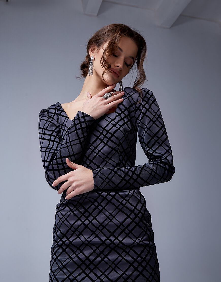 Надзвичайно красива сукня з квадратними вирізом і об’ємними рукавами. Тканина з бандажним ефектом прекрасно підкреслює фігуру, а асиметричні оксамитові смужки візуально подовжують силует. Сукня ззаду застібається на потаємну блискавку.