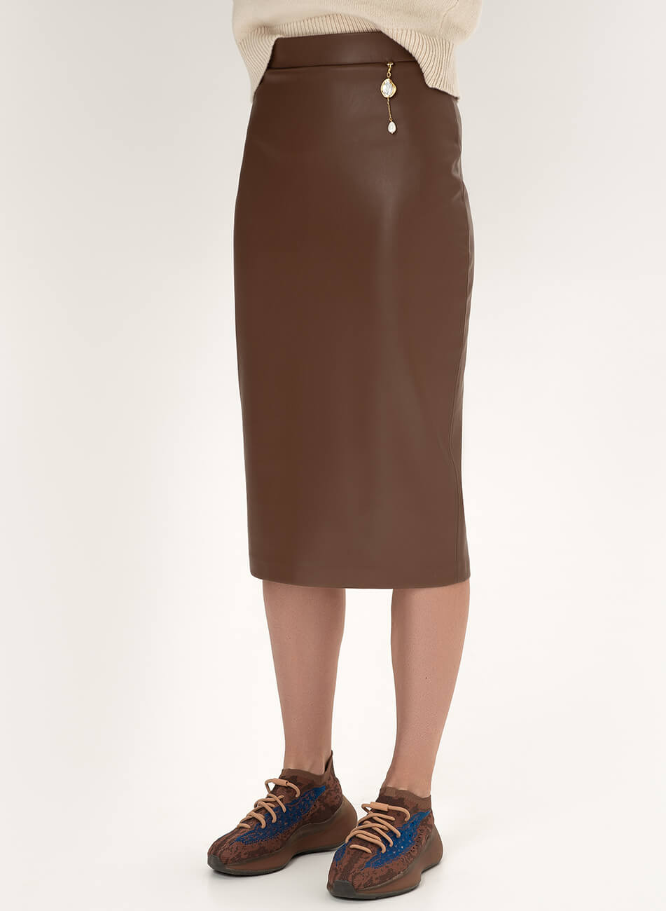 Класична спідниця з еко-шкіри. Декор із перлів не входить до комплекту. Еко-шкіра для виробництва спідниці була протестована і показала високі показники зносостійкості та стійкості до впливу зовнішнього середовища. Гарантія на матеріал: до 5 років.