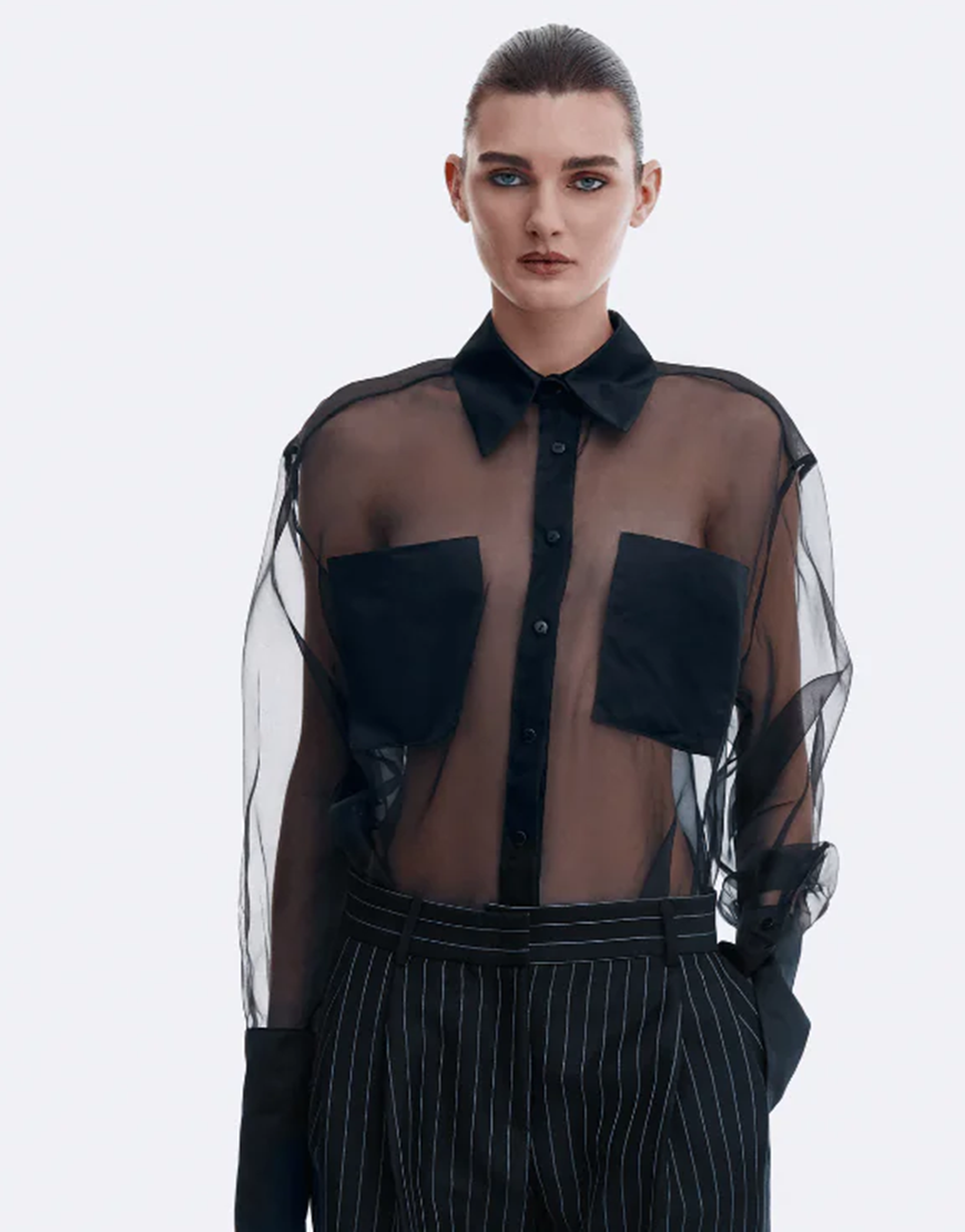Доставка впродовж 2-5 робочих днівПрозора чорна сорочка з натурального шовку — річ, яка говорить без слів. Легка, струмка, смілива. Завдяки щільним накладним кишеням та класичному крою балансує між сексуальністю й структурністю. Носіть її на голе тіло, з топом або контрастною білизною — як хочеться саме вам.