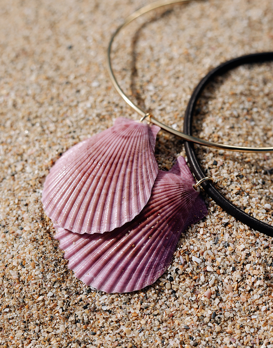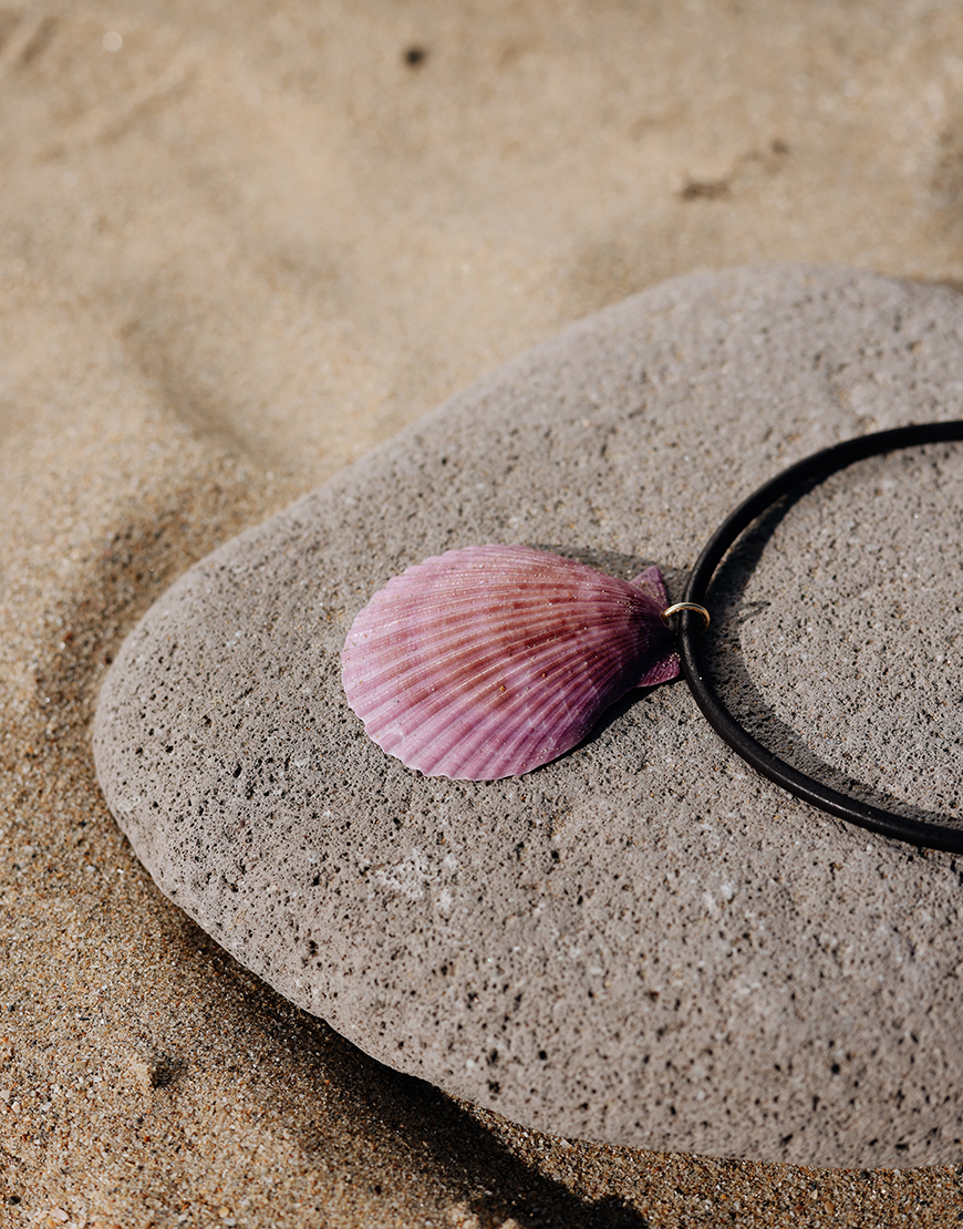 80% чокер з натуральної шкіри, 20% натуральна мушля гребінця фіолетового кольору (зверніть увагу: прикраса створена з натуральної мушлі, тож можливі незначні відмінності в кольорі та розмірі)