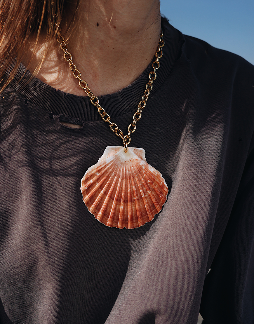 80% металевий ланцюжок з золотим напиленням, 20% натуральна мушля великого гребінця (зверніть увагу: прикраса створена з натуральної мушлі, тож можливі незначні відмінності в кольорі та розмірі)