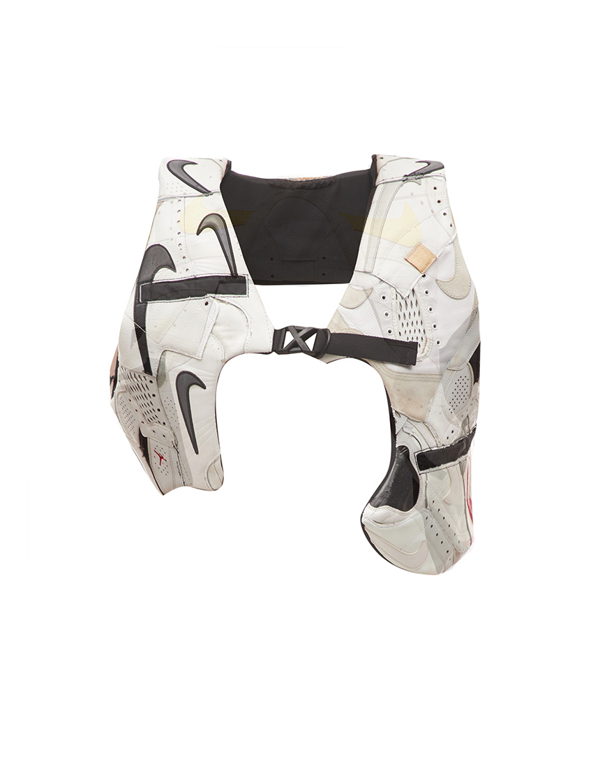Асиметричний жилет унісекс, де перетинаються дизайн та екологічність. Виготовлений з перероблених шкіряних кросівок, він має дві функціональні кишені для практичності. Цей жилет – яскравий виріб з екологічним акцентом, який став частиною другого показу колекції “Sneaker Riot” на Berlin Fashion Week Spring/Summer 2025.