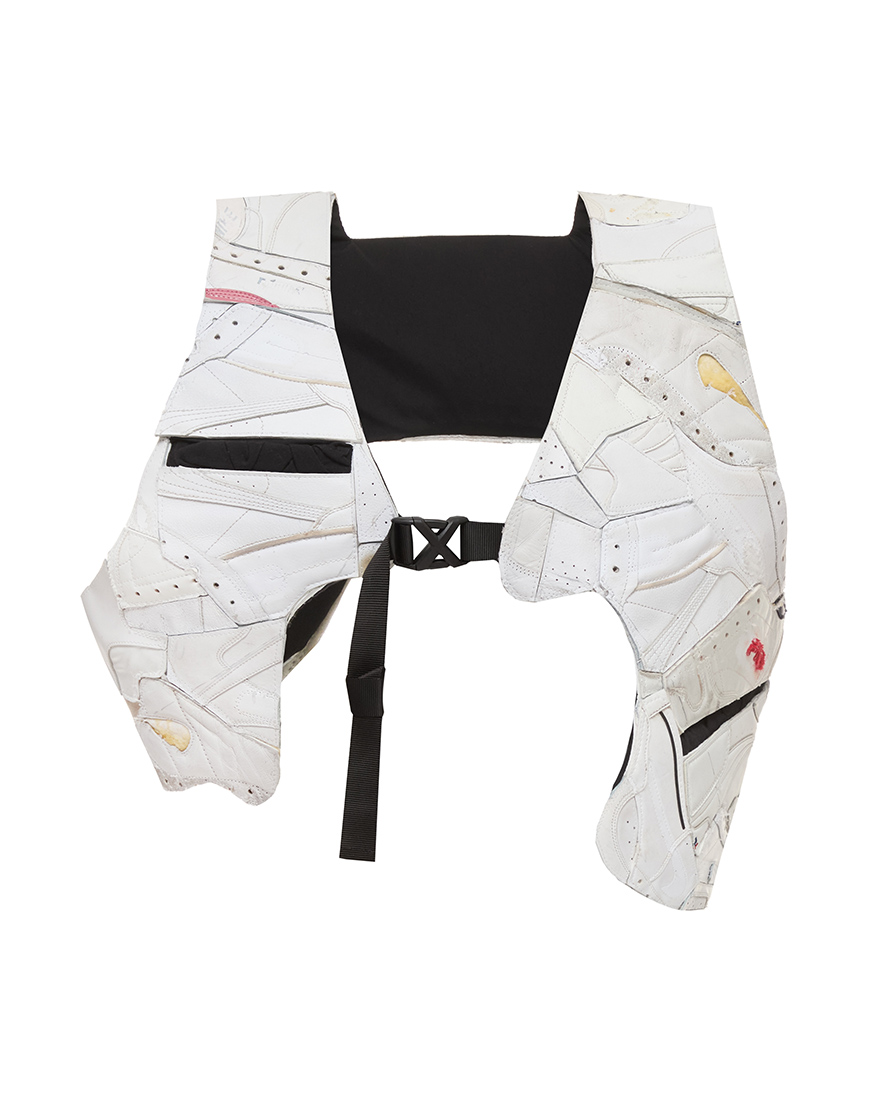 Асиметричний жилет унісекс, де перетинаються дизайн та екологічність. Виготовлений з перероблених шкіряних кросівок, він має дві функціональні кишені для практичності. Цей жилет – яскравий виріб з екологічним акцентом, який став частиною другого показу колекції “Sneaker Riot” на Berlin Fashion Week Spring/Summer 2025.