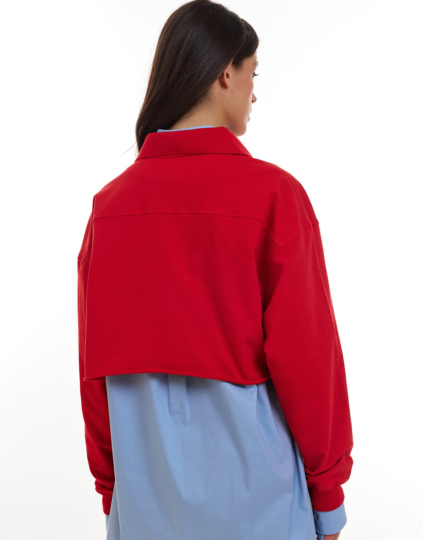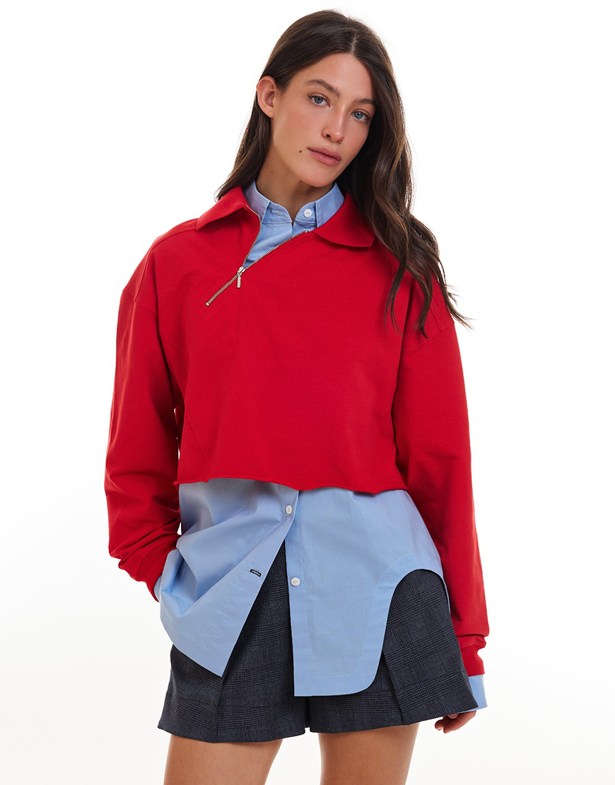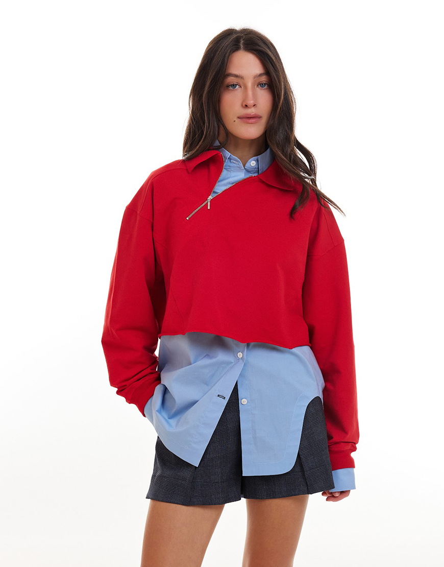 Світшот – поло з боковою блискавкою у червоному кольорі. Оверсайз силует та необроблений низ.