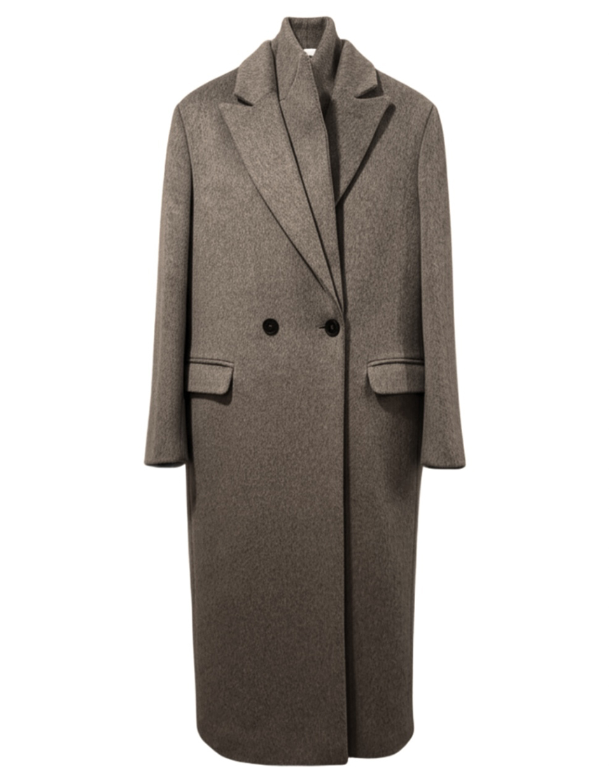 Доставка впродовж 5-12 робочих днівДвобортне пальто кольору мокко, виготовлене з високоякісної вовняної тканини з коротким ворсом, що забезпечує комфорт і тепло. Приємна на дотик текстура та особлива деталь у вигляді знімкового коміру, який повністю повторює форму латканів. Це дозволяє легко змінювати образ: від елегантного та класичного до більш розслабленого, без зайвих деталей.