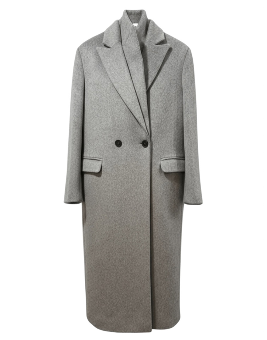 Доставка впродовж 5-12 робочих днівДвобортне світло-сіре пальто, виготовлене з високоякісної вовняної тканини з коротким ворсом, що забезпечує комфорт і тепло. Приємна на дотик текстура та особлива деталь у вигляді знімкового коміру, який повністю повторює форму латканів. Це дозволяє легко змінювати образ: від елегантного та класичного до більш розслабленого, без зайвих деталей.
