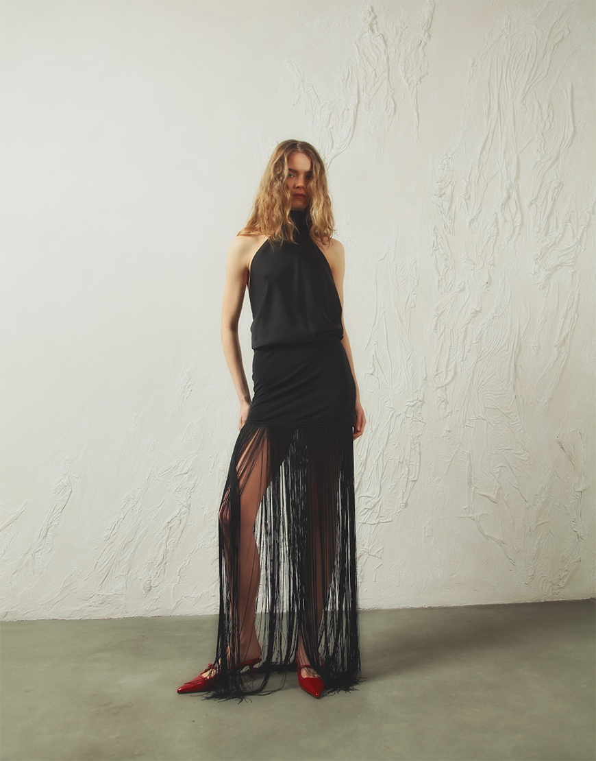 Доставка впродовж 5-12 робочих днівМіні спідниця прямого крою з виразною бахромою, яка створює ефектний рух при ходьбі. Витончена й водночас зухвала, ця спідниця додає індивідуальності будь-якому образу, від вечірнього до повсякденного. Лаконічний верх стане ідеальним доповненням. Вкоротити довжину бахроми під власний зріст можна самостійно звичайними ножицями (вкорочувати бахрому найкраще під взуття з яким плануєте носити)