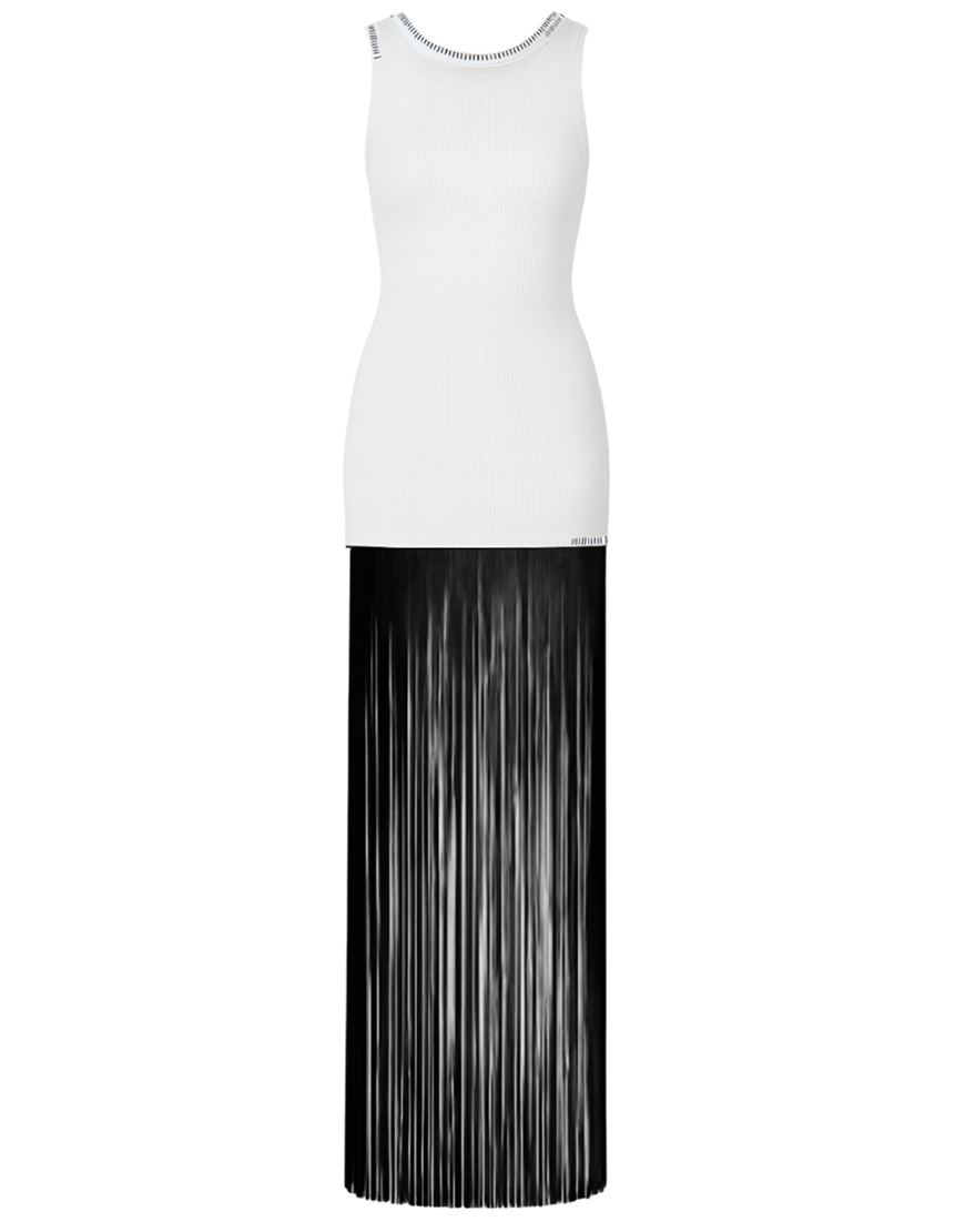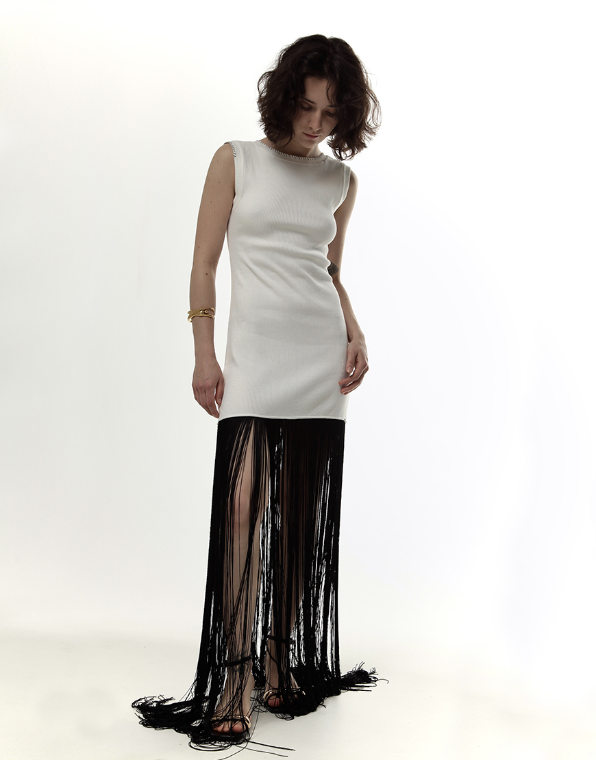Доставка впродовж 5-12 робочих днівЦя сукня — уособлення сучасної жіночності з ноткою бунтарства. Чорна трикотажна основа щільно облягає тіло, створюючи виразний силует, тоді як довга бахрома в нижній частині додає динаміки та театрального ефекту при кожному русі. Це не просто декор — це ритм і рух, які оживають у просторі.