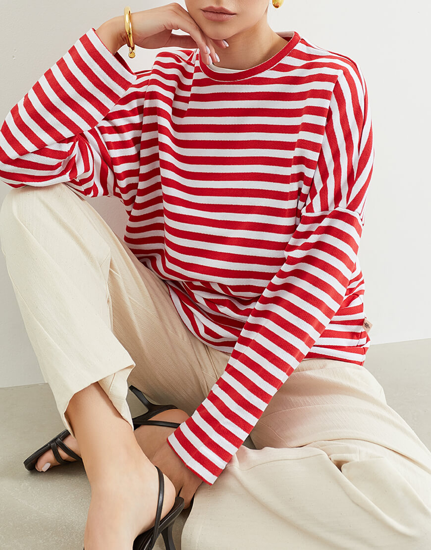 Доставка впродовж 2-5 робочих днівБавовняний тільник у червону смужку, зі спущеним плечем