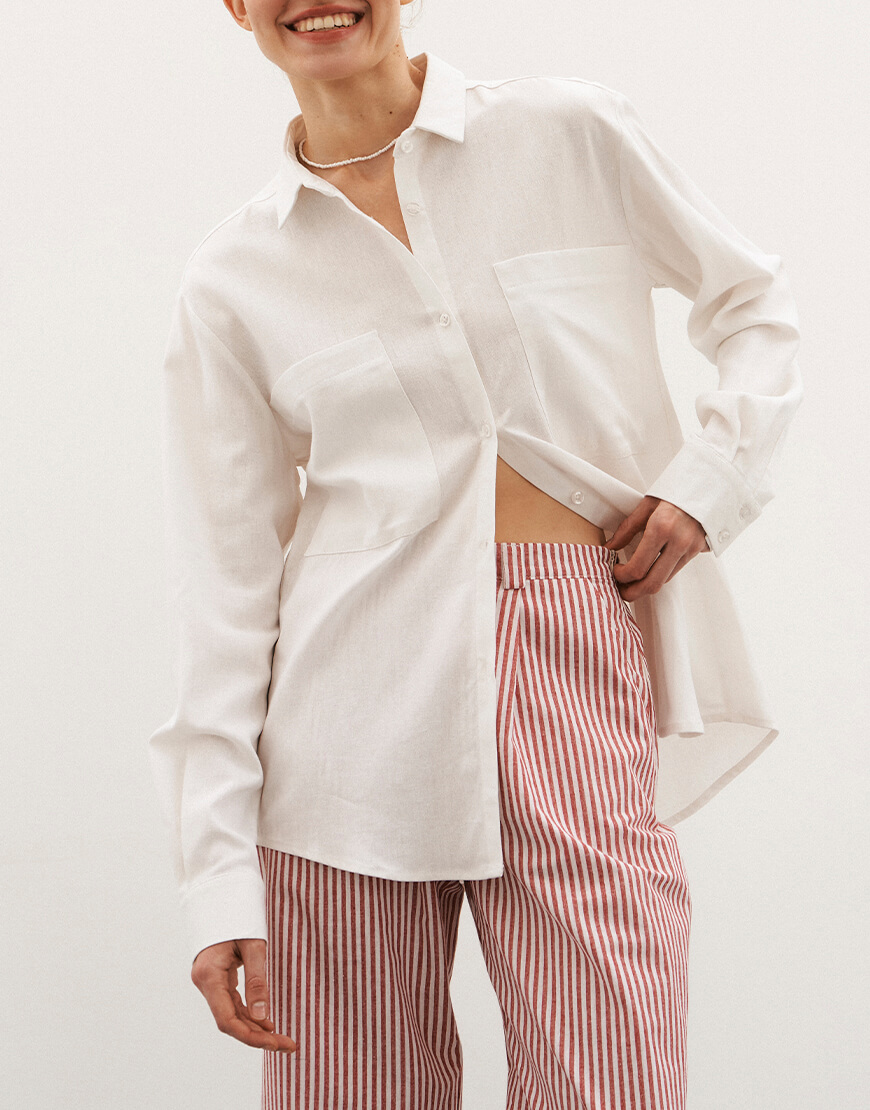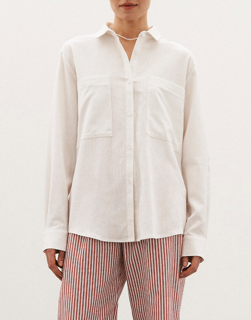 Вільна льняна сорочка з складою по спинці, з довгим руквом, з накладними карманами.