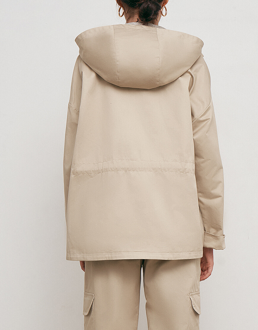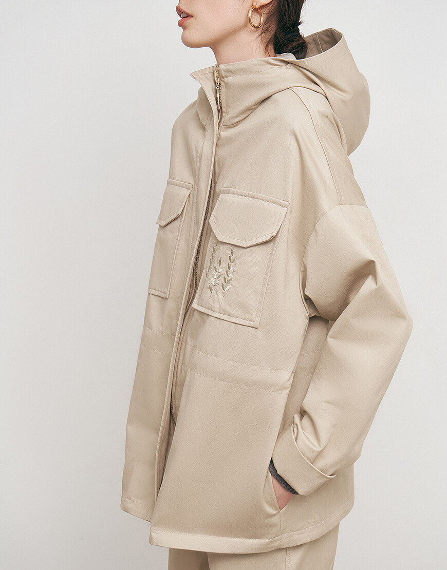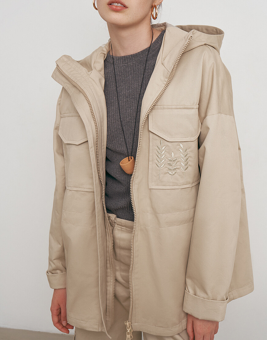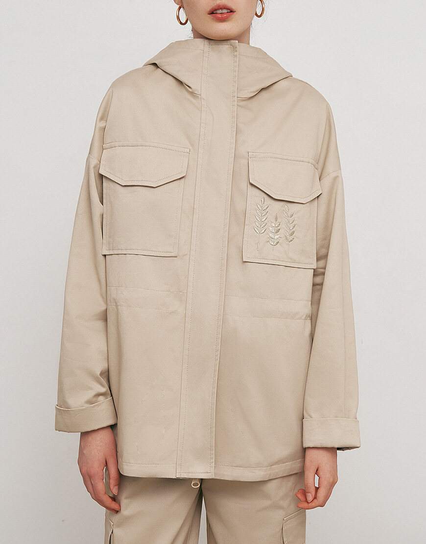 Куртка вільного крою, зі спущеним рукавом, капюшоном, вишивкою на кишені. З кулісою на таліі