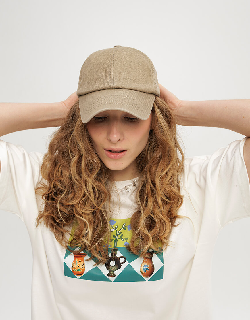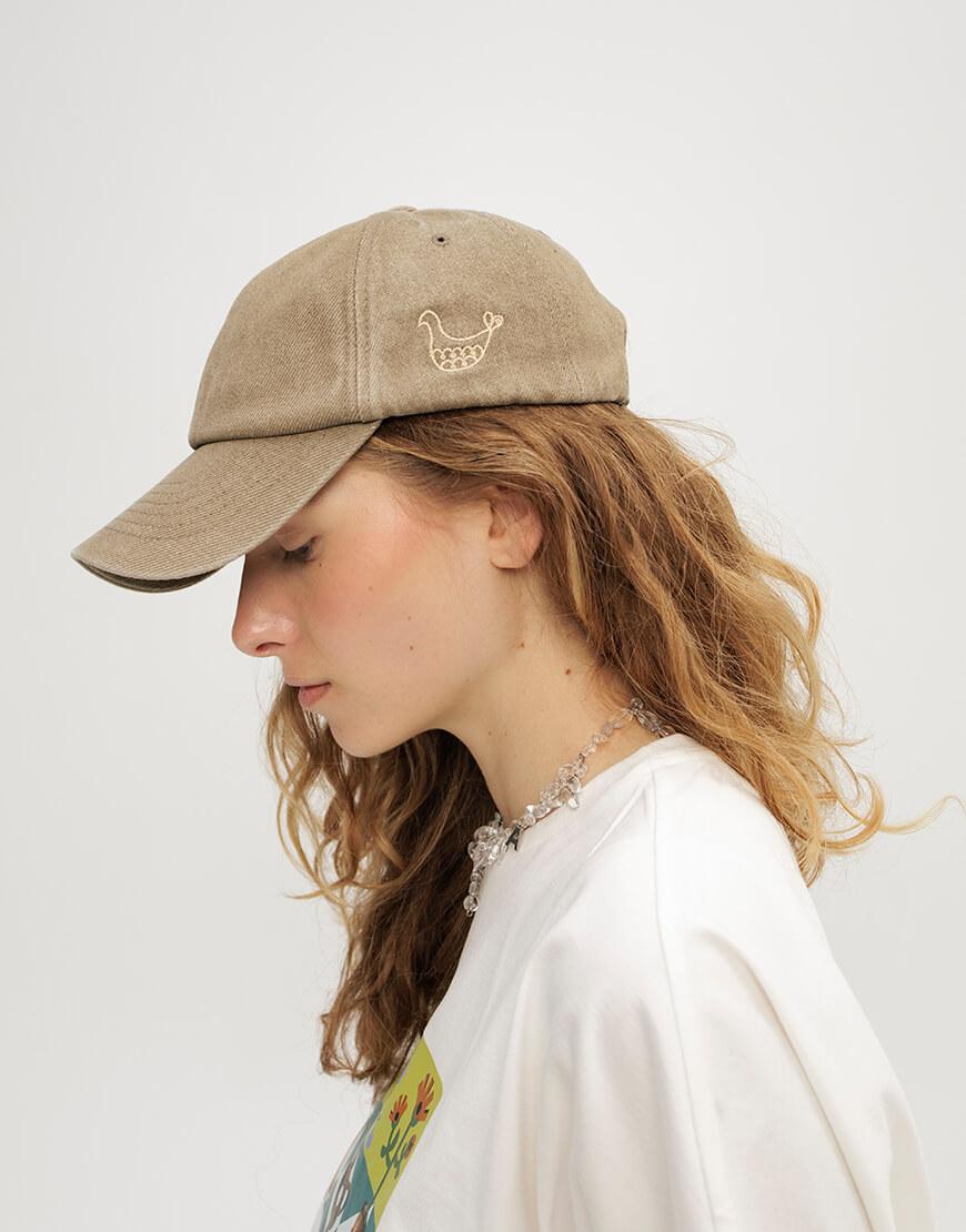 Доставка впродовж 2-5 робочих днівКепка з вивареної бавовни, бежевого кольору з вишитими пташками