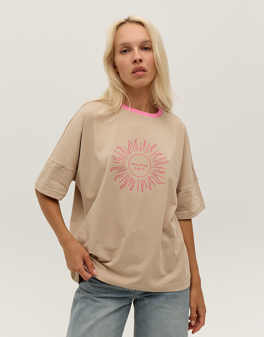 Доставка впродовж 2-5 робочих днівВілна футболка бежевого кольору зі спущеним плечем з принтом “Сонце завжди сходить”