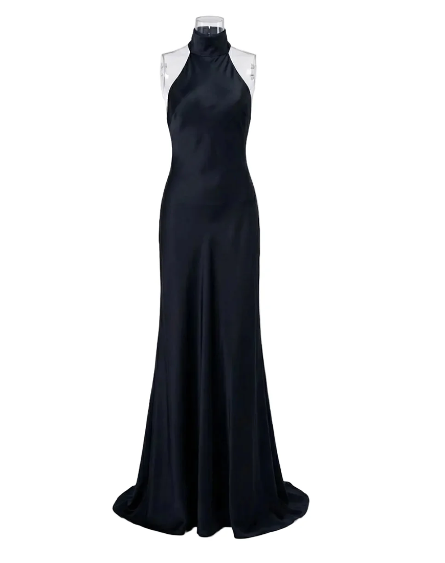 Створена з 100% ліоцеллу, вона м’яко огортає тіло, даруючи дихаючий комфорт і бездоганний крій. Високий комір плавно переходить у відкриту спину, створюючи образ, що поєднує стриманість і спокусу. Регульована зав’язка ззаду дозволяє ідеально посадити сукню, підкреслюючи фігуру без зайвих деталей.