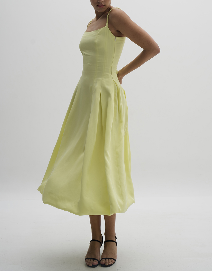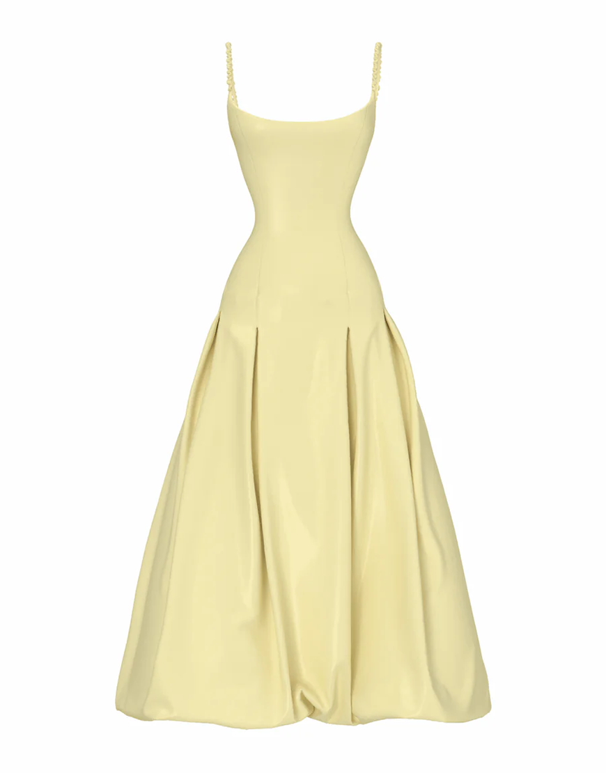 Відкрийте для себе витонченість сукні Butter Cup, створеної з преміального матеріалу TENCEL і оздобленої деталями ручної роботи. Елегантний крій у формі дзвона та напівкорсетна застібка акцентують талію, гарантуючи ідеальну посадку. Сукня доповнена високоякісними блискавками YKK та підкладкою з розкішної італійської віскози, що надає образу вічної класики та бездоганного виконання.