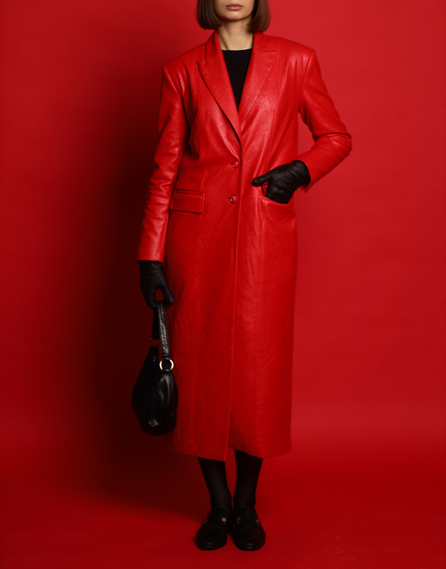 Доставка впродовж 2-9 робочих днівІдеальне стейтмент пальто для твого базового гардеробу. Виготовлене з текстурованої еко-шкіри соковитого червоного кольору. Зсередини італійська червона підклада зі 100% натуральної віскози.