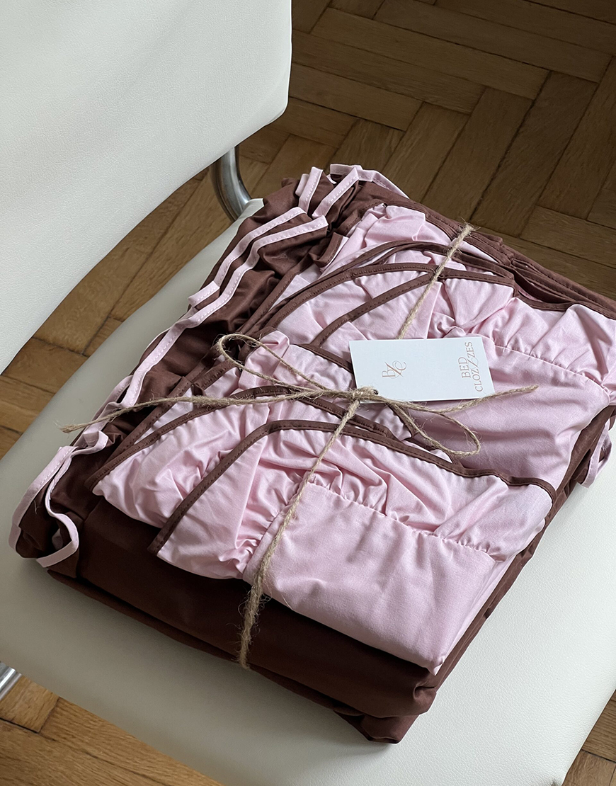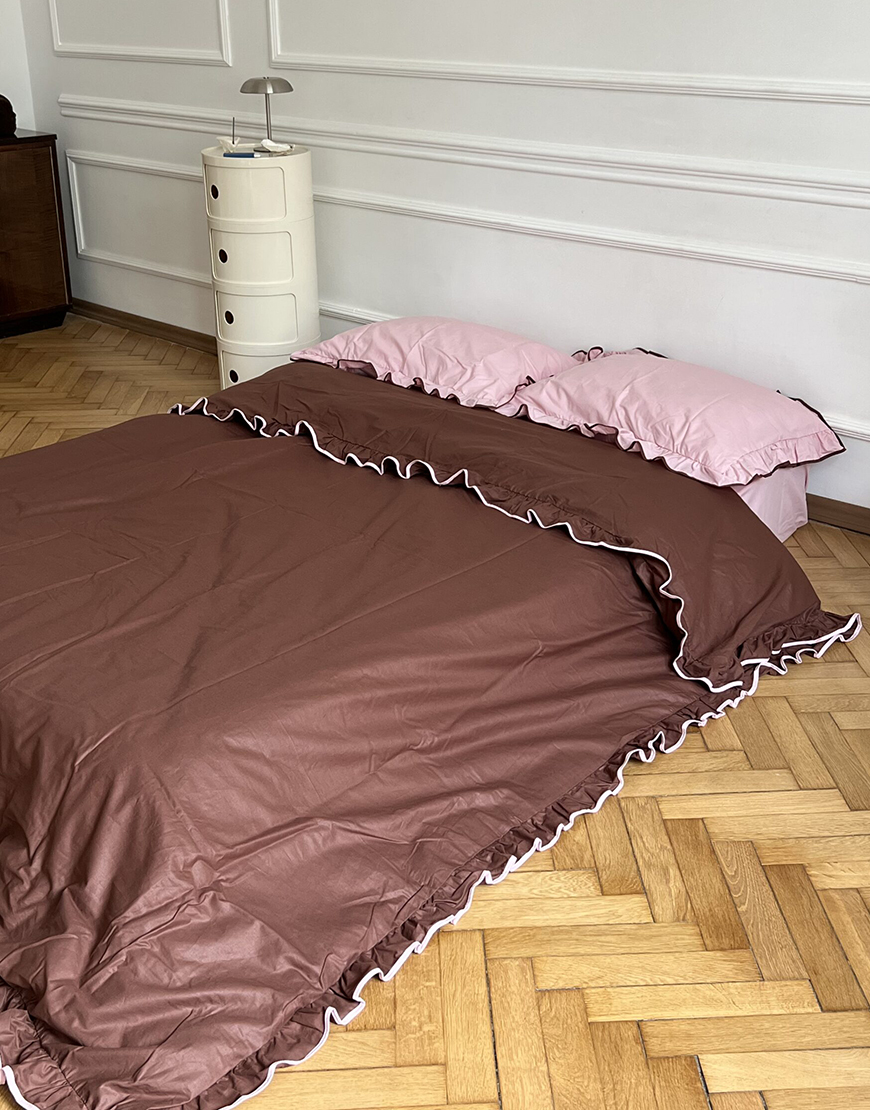 Комплект постільної білизни шоколадний ранфорс з рюшами та рожевим кантом
