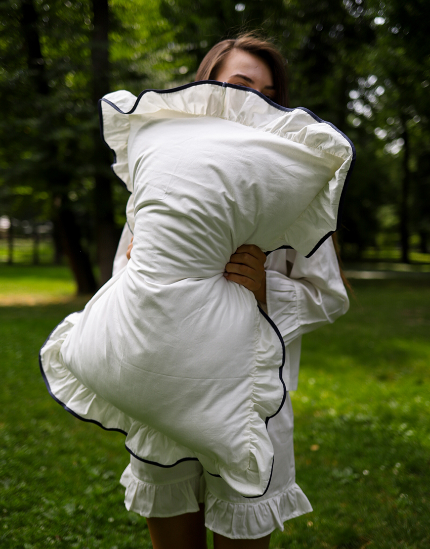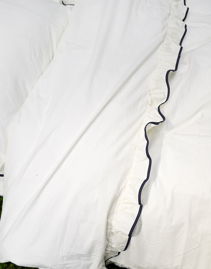 Комплект постільної білизни молочний ранфорс з рюшами та синім кантом