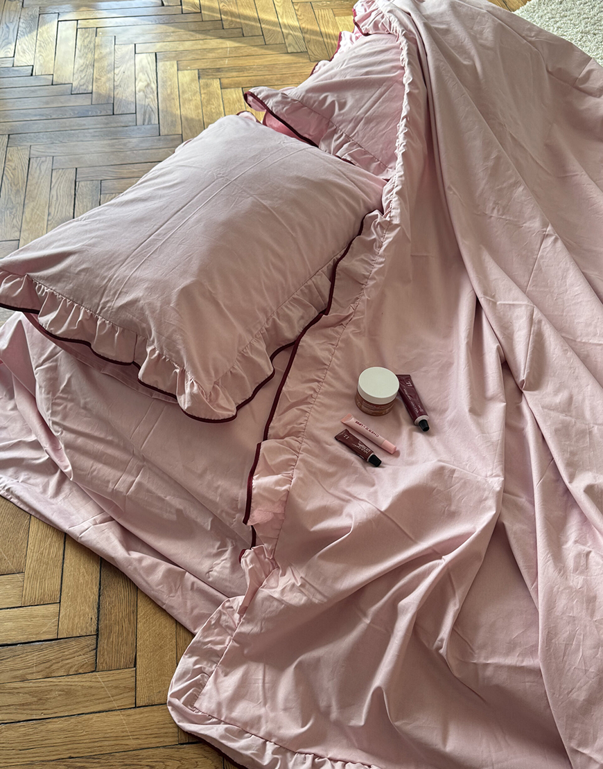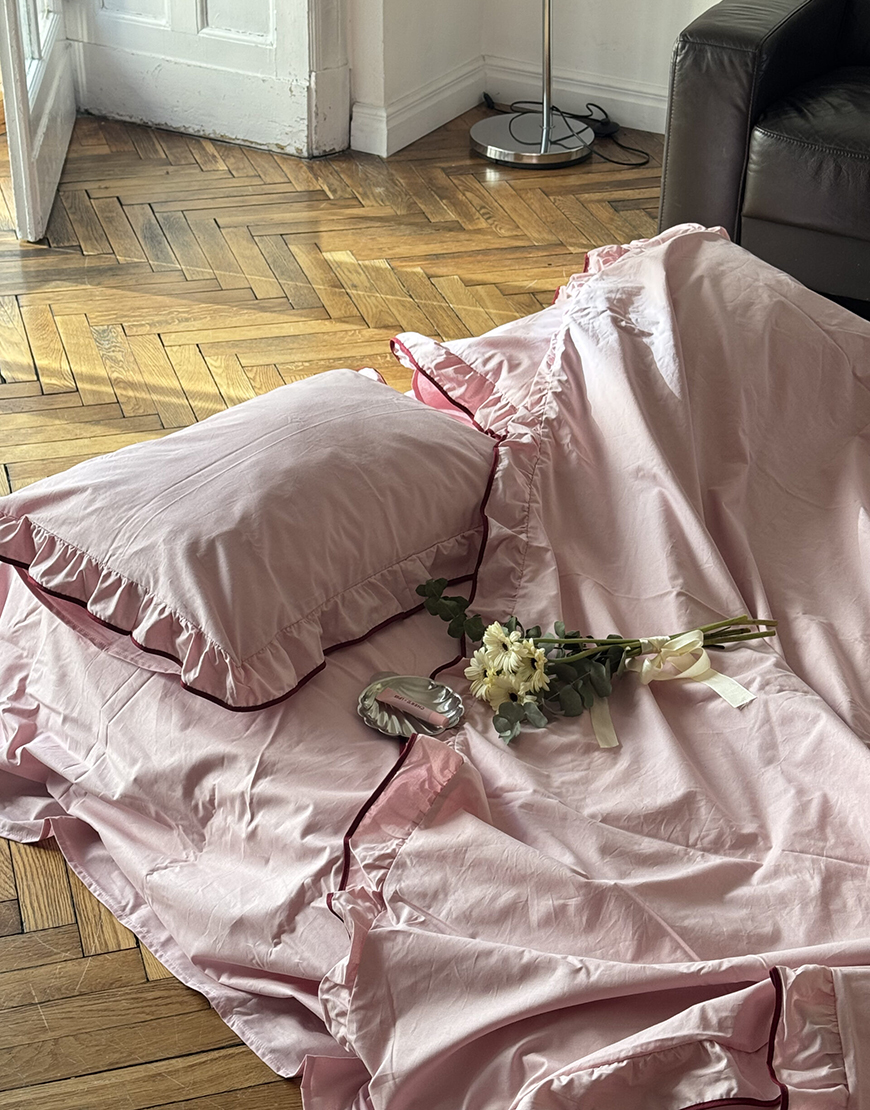 Постільна білизна пудрового кольору з рюшами та бордовим кантом