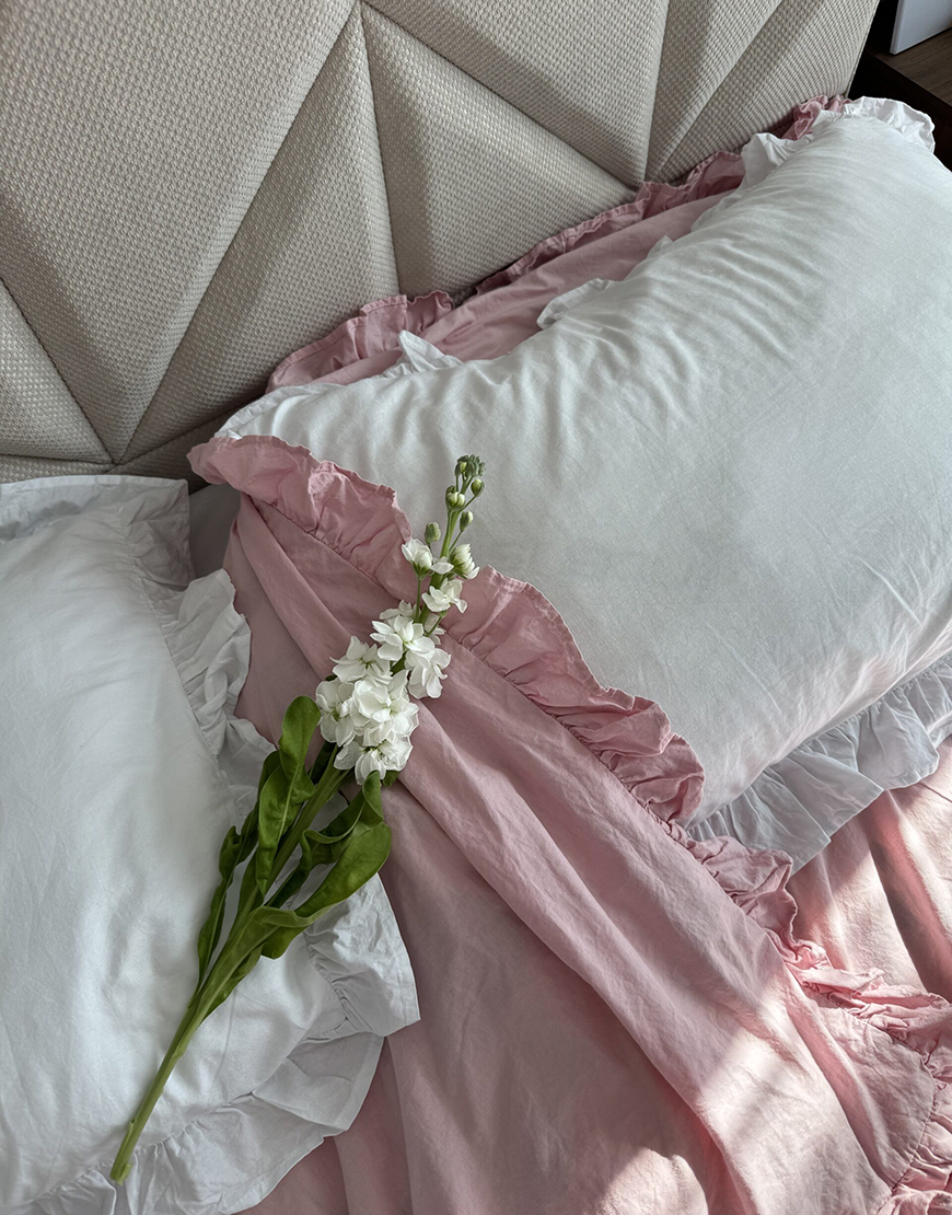 Доставка протягом 10 робочих днівКомплект постільної білизни з ранфорсу, у комплект входить: простирадло, підковдра з рюшками оздоблена кантом та дві наволочки з рюшками оздоблені кантом. Шиється та збирається повністю вручну! Ранфорс-турецька преміальна тканина, у складі лише 100% бавовна. Тканина дихаюча , має чудову терморегуляцію, не парить, не утворює ковтунців, має високу щільність та витримує більше 300 циклів прання без втрати якості та кольору.