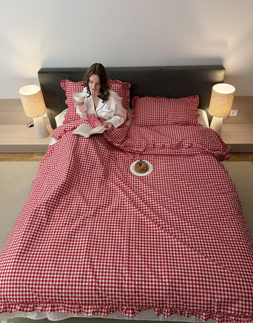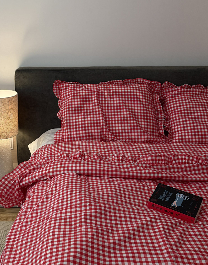 Комплект постільної білизни червона клітинка з рюшами