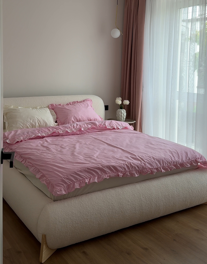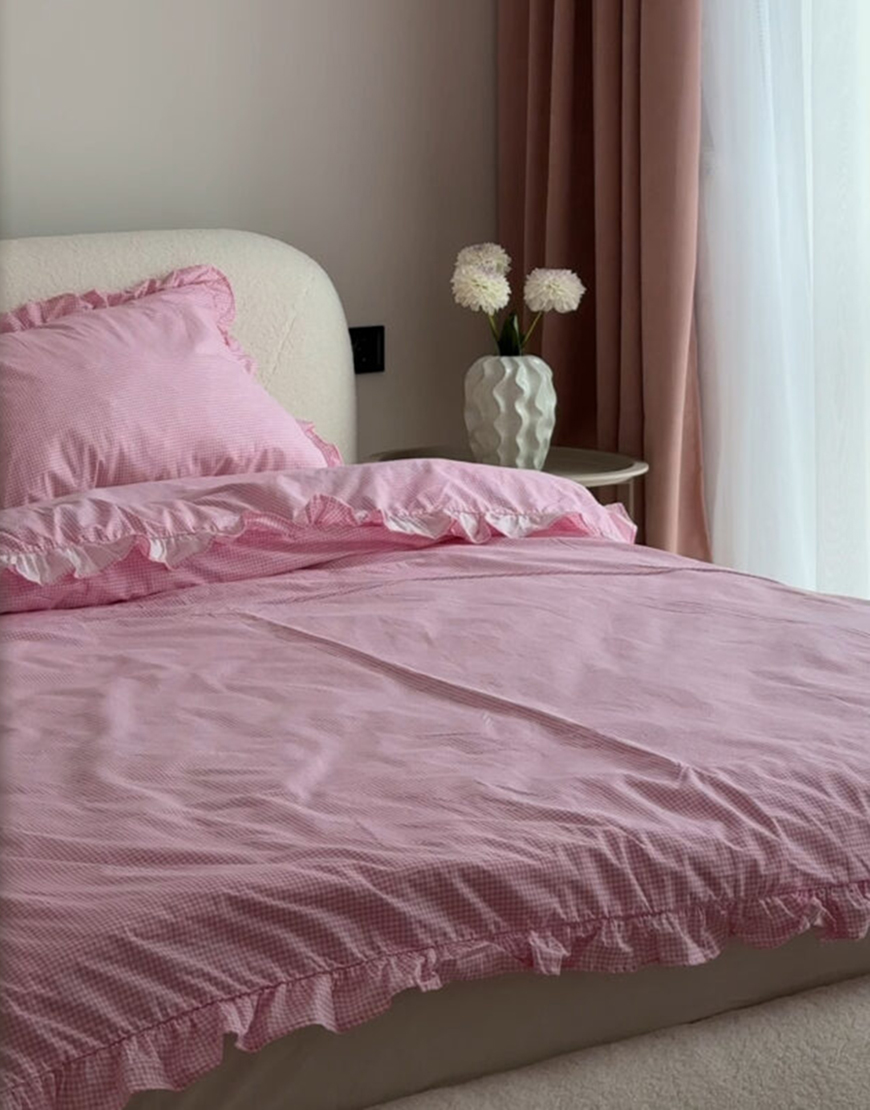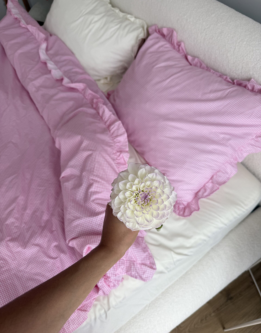 Комплект постільної білизни рожева клітинка з молочним кантом та рюшами
