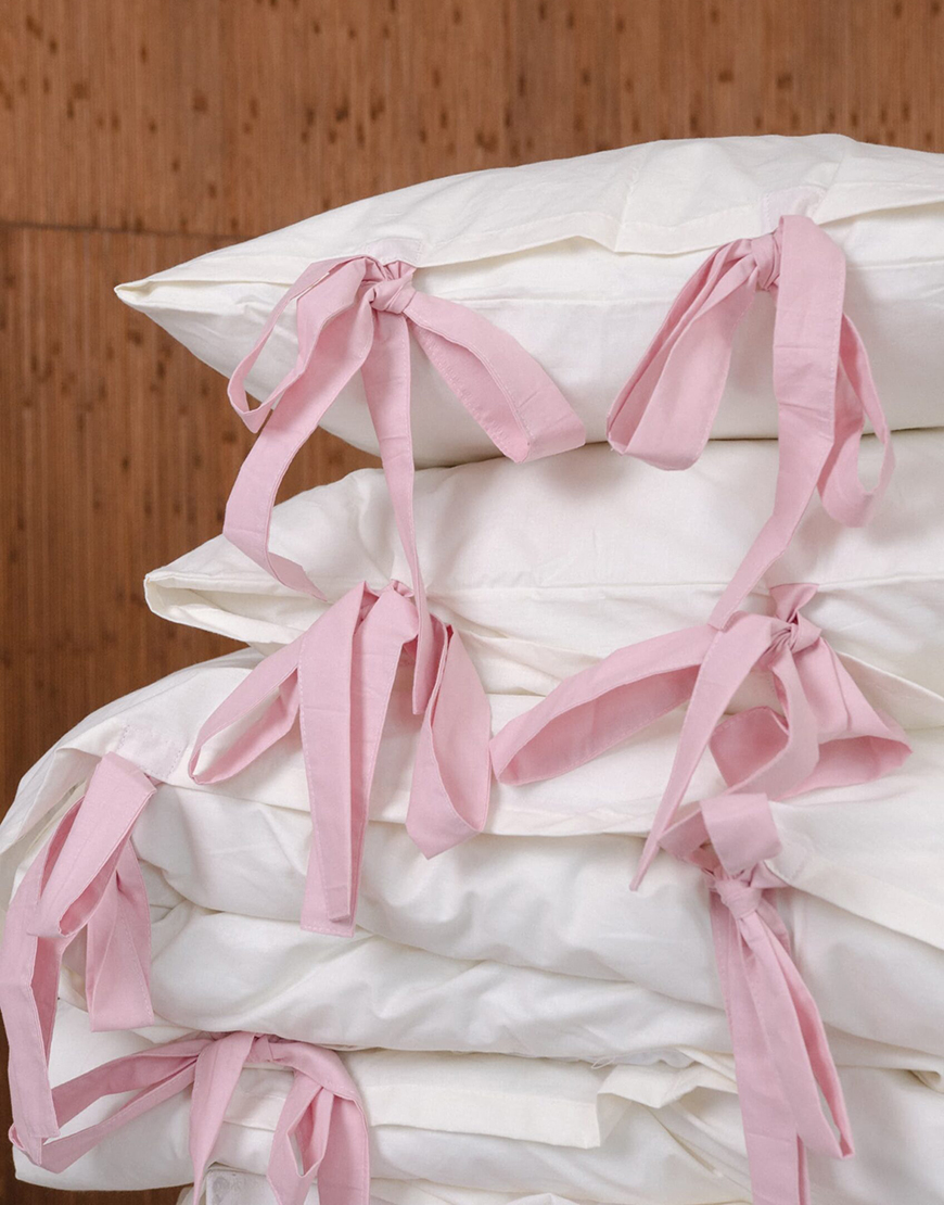 Комплект постільної білизни молочний ранфорс з рожевими зав’язками