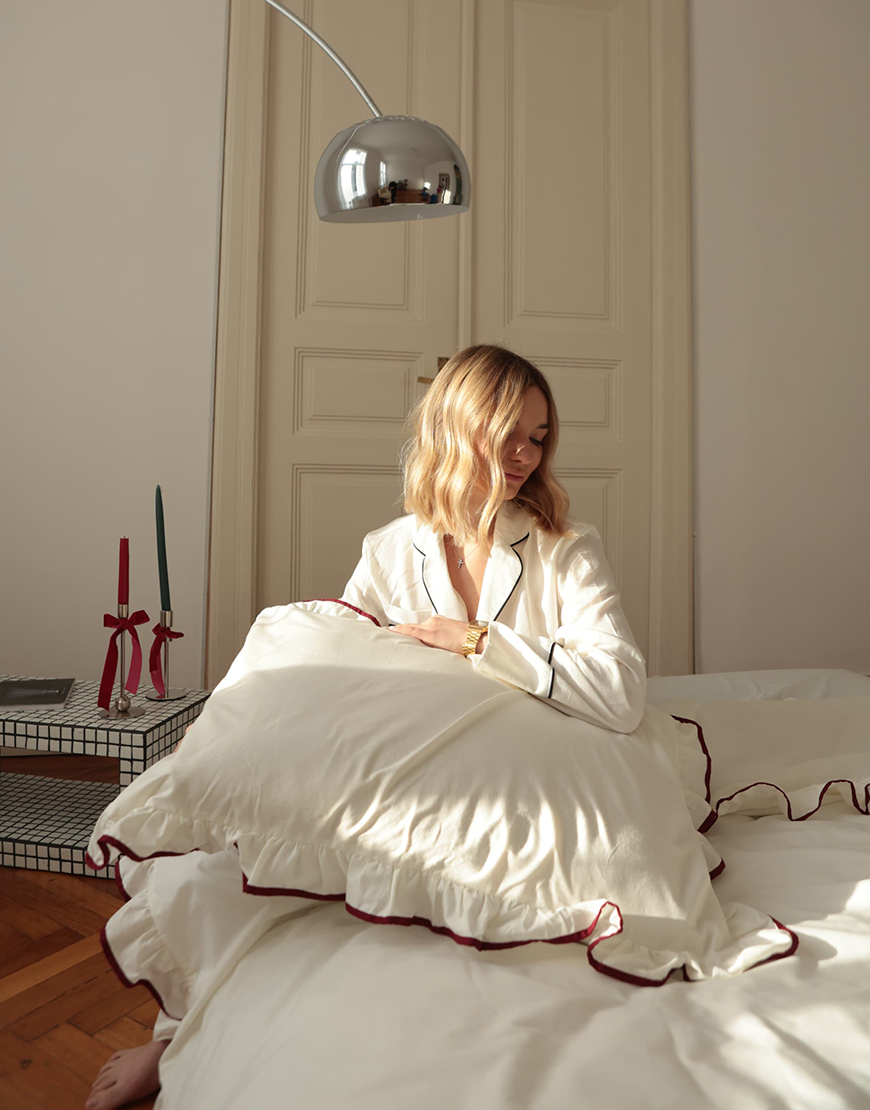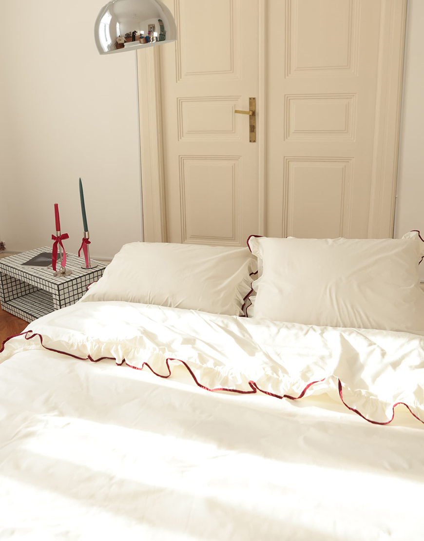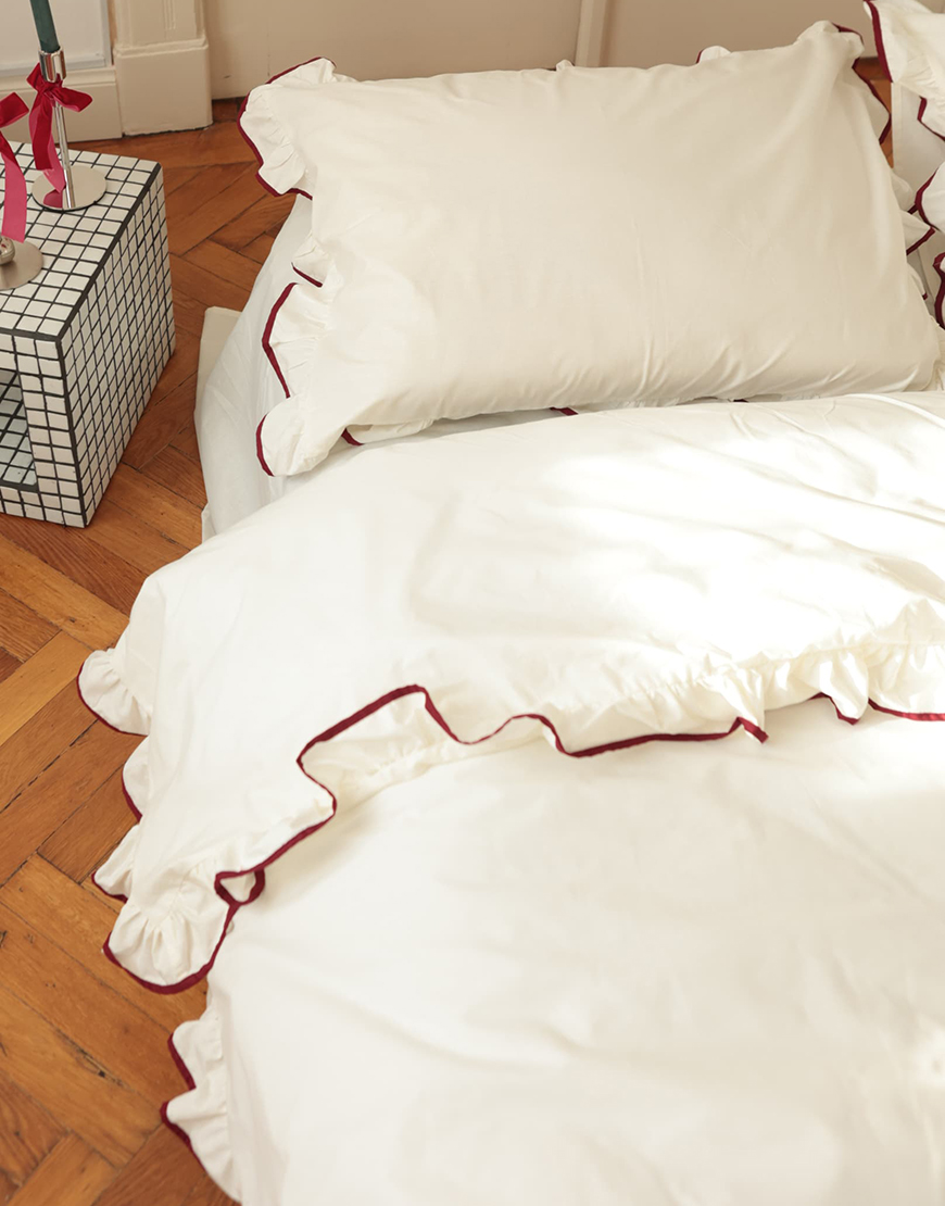 Комплект постільної білизни з рюшами та бордовим кантом