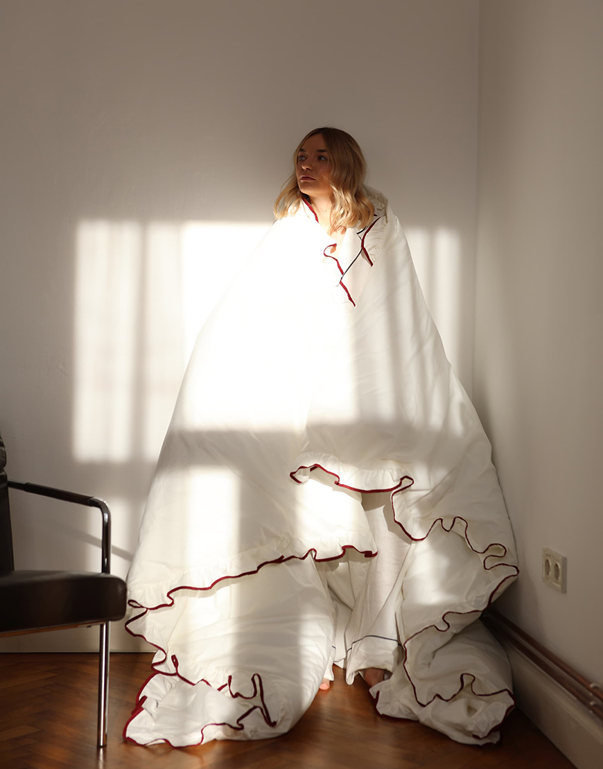 Доставка протягом 10 робочих днівКомплект постільної білизни з ранфорсу, у комплект входить: простирадло, підковдра з рюшками оздоблена кантом та дві наволочки з рюшками оздоблені кантом. Шиється та збирається повністю вручну! Ранфорс-турецька преміальна тканина, у складі лише 100% бавовна. Тканина дихаюча , має чудову терморегуляцію, не парить, не утворює ковтунців, має високу щільність та витримує більше 300 циклів прання без втрати якості та кольору.