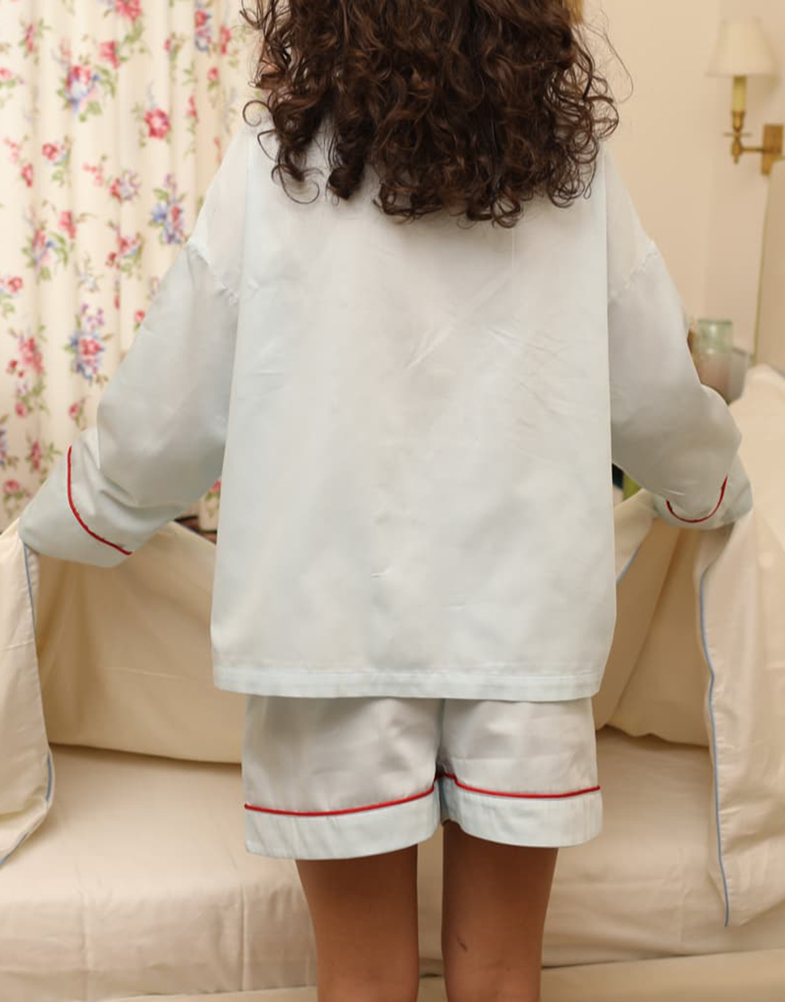 Сатинова піжама блакитного кольору з червоним кантом