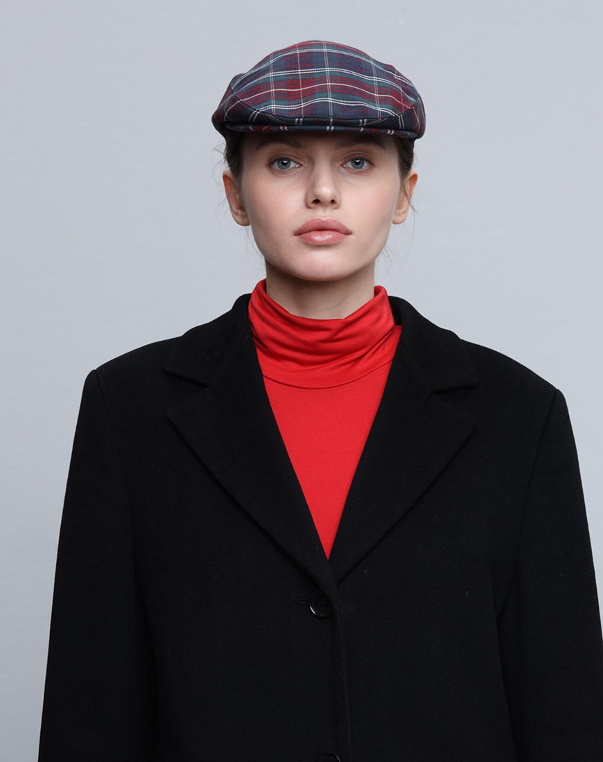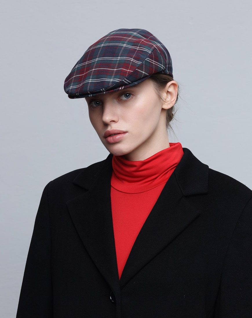 Наші картузи Baker Boy Cap.02 виготовлені із костюмної тканини зеленого кольору у трендову червону клітинку. Завдяки тканині середньої щільності виріб утворює м’яку, але стійку форму.
