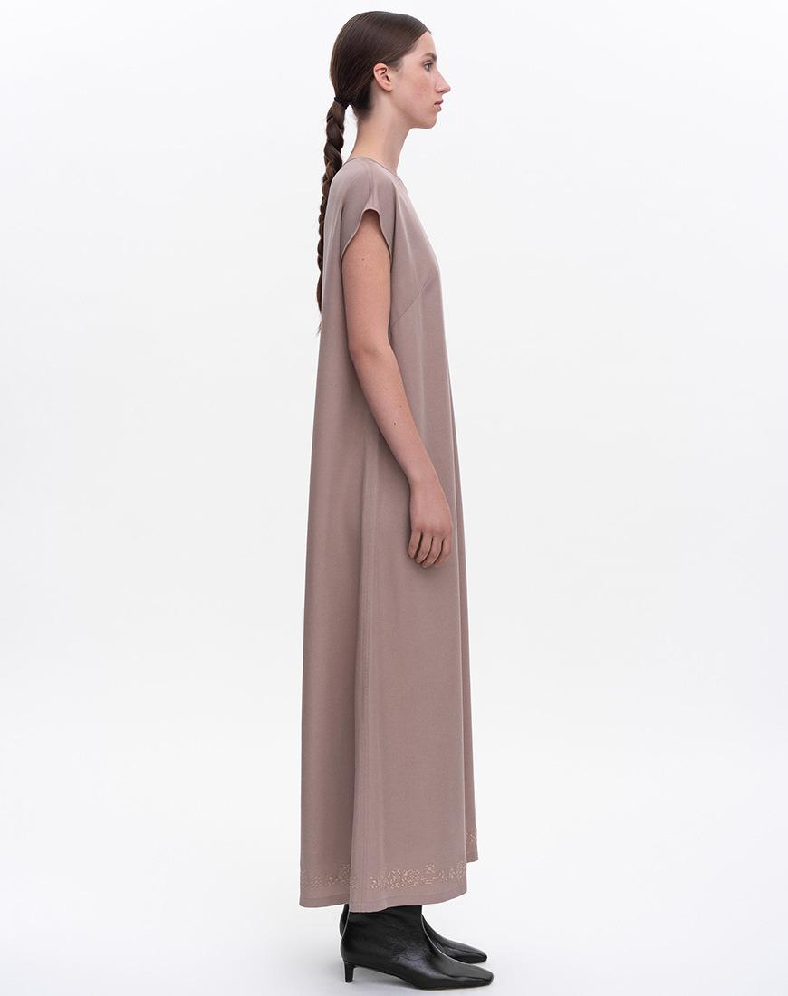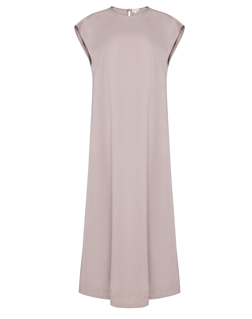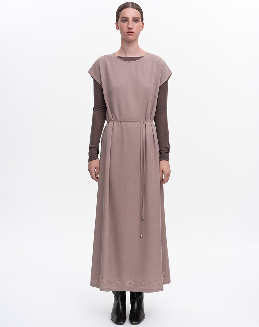 Монохромна вишивка в тон тканини оздоблює поділ, наслідуючи давні ручні стібки. Сукня має вільний крій, круглу горловину та короткі рукави. Її доповнює тонкий пояс із металевими намистинами.