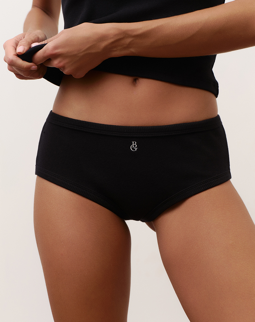 Труси-сліпи з високою посадкою, виконані з делікатної бавовни у фактурний рубчик. Модель має закриту форму задньої частини та еластичну тасьму по талії, що забезпечує надійну фіксацію та гармонійний силует. Тонка повітропроникна тканина з додаванням еластану дарує відчуття невагомості протягом дня. Особливістю виробу є вишитий логотип BG по центру та технологічна обробка швів, яка дозволяє білизні залишатися максимально комфортною, забезпечуючи делікатне облягання фігури без зайвого тиску.