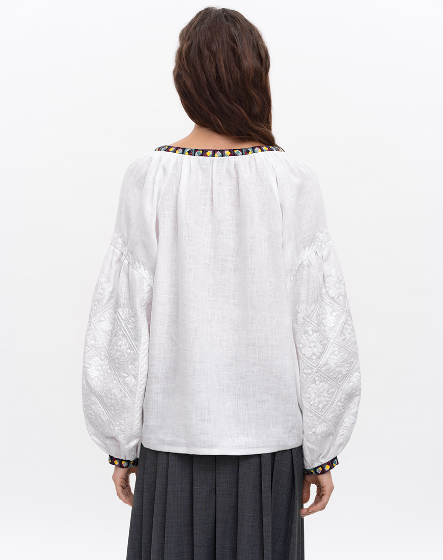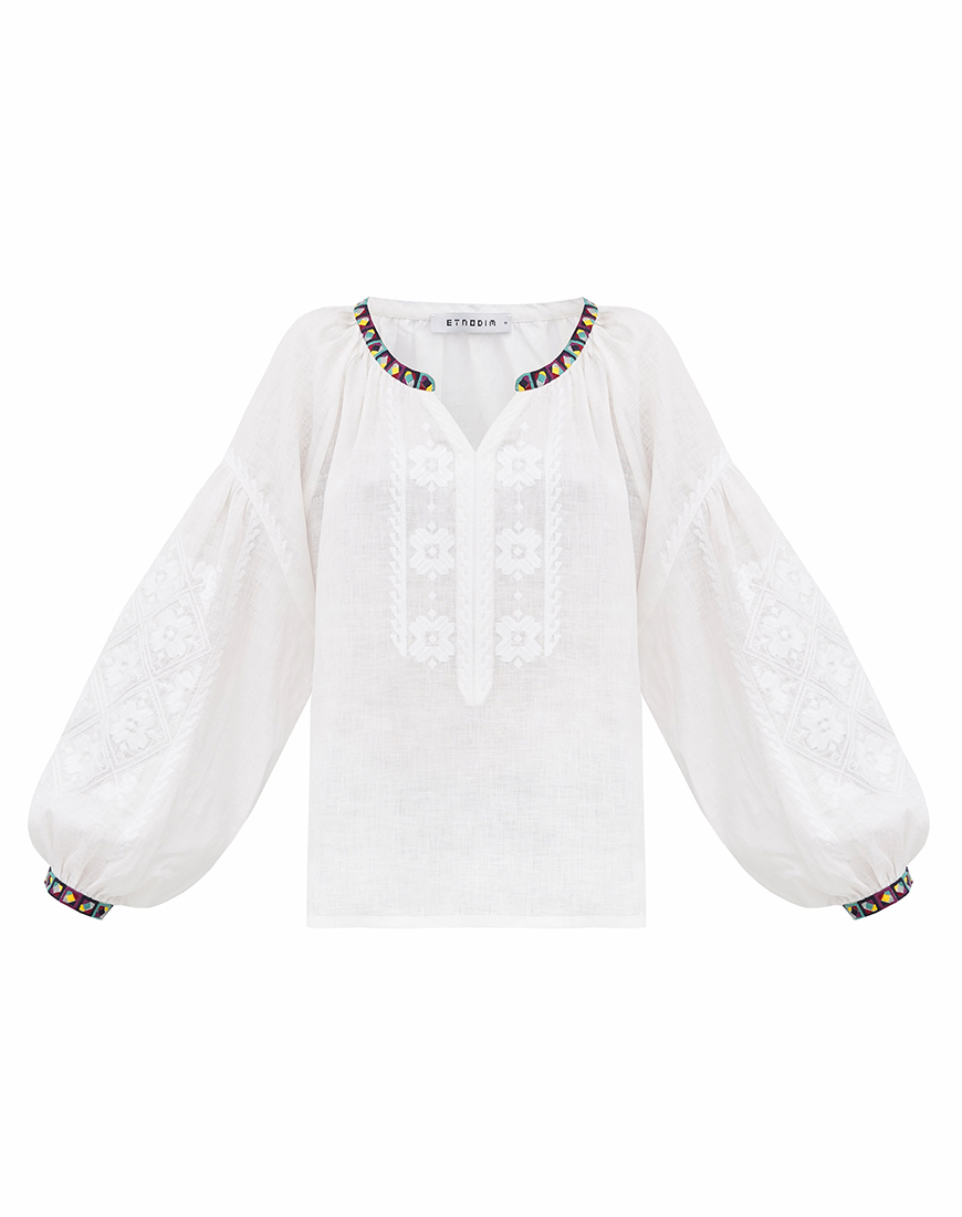 Доставка протягом 2-5 робочих днівЖіноча сорочка з довгим рукавом реглан. Нижня частина рукава збирається зверху та знизу. Має центральний V-подібний виріз. Горловина на зборці.