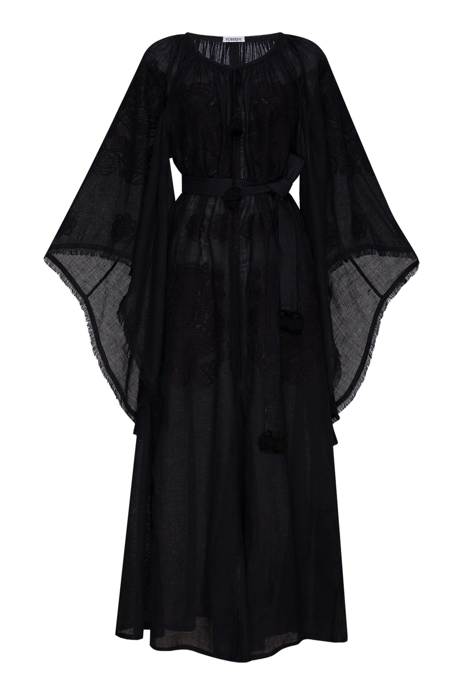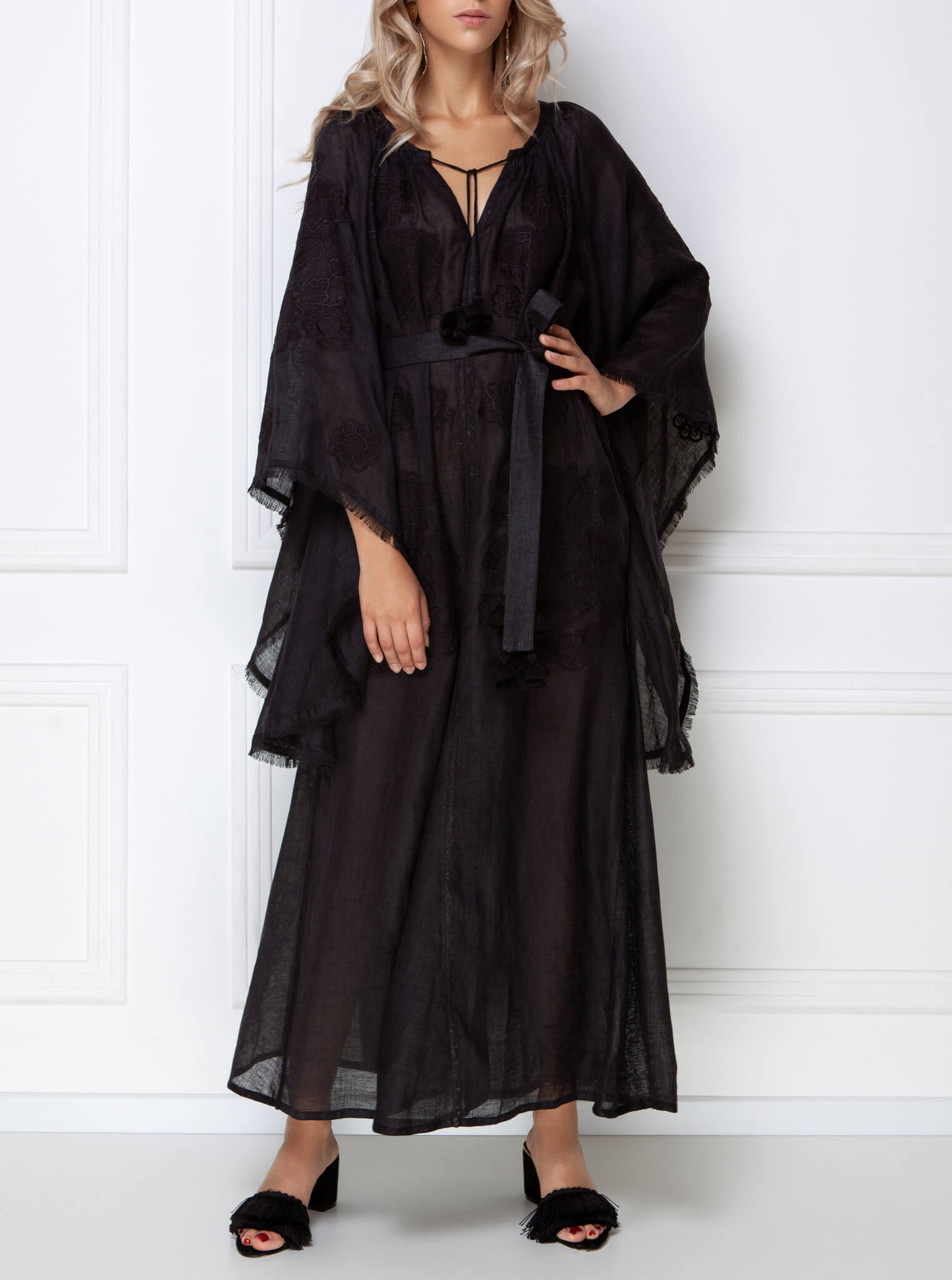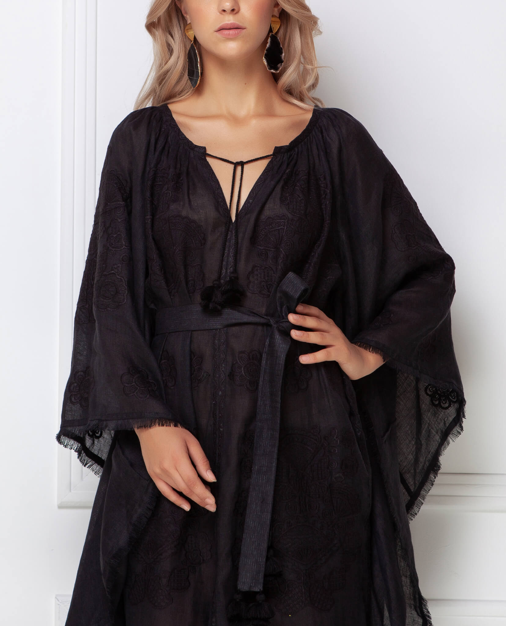 Оздоблена вишивкою квітковим орнаментом у тон тканини. Має широкі вишиті рукави з бахромою по краю, зав’язки з кісточками на горловині. Вишуканий орнамент, жіночний силует, елементи ручної роботи роблять цю богемну сукню чудовим вбранням для подорожей.