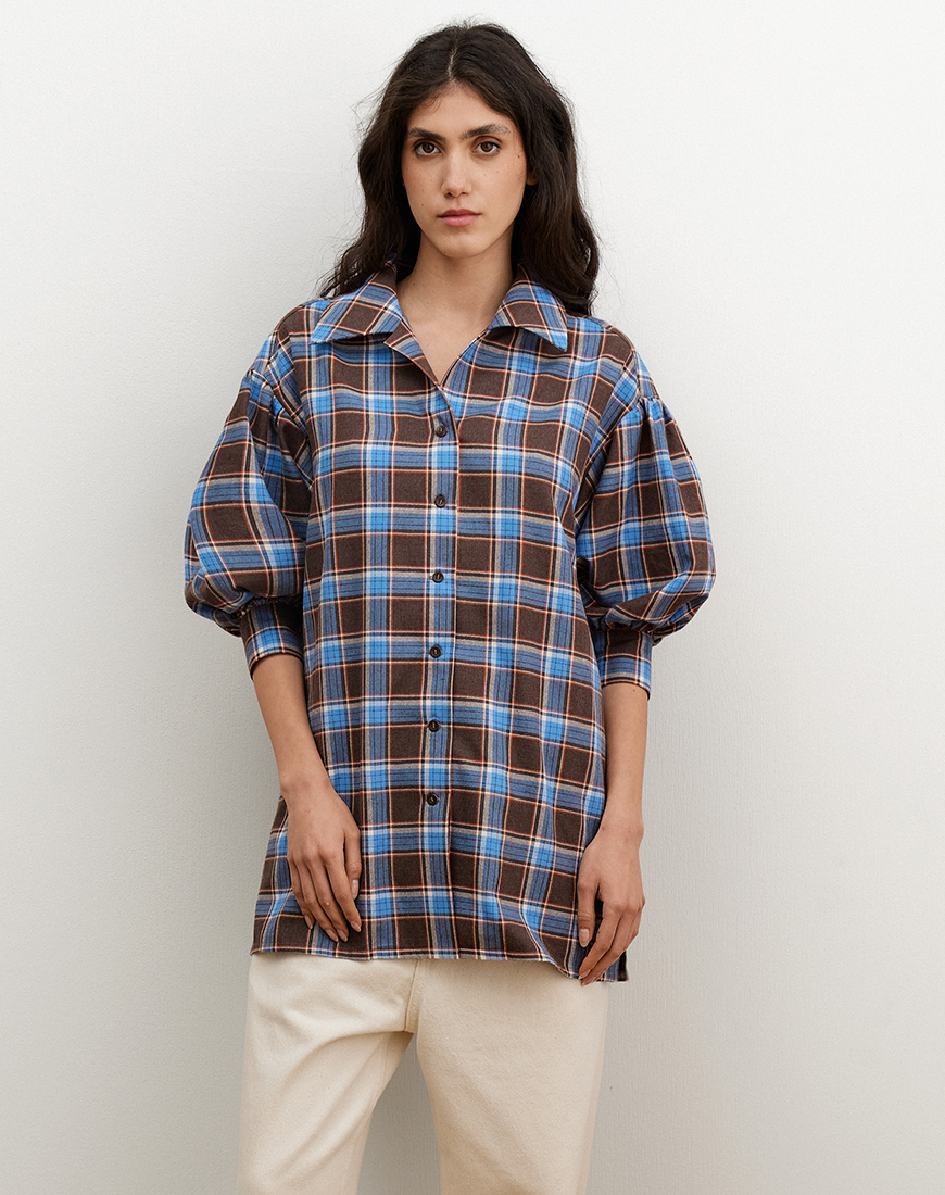 Мʼяка фланель створює комфорт, а акцентні рукави додають образу архітектурності.