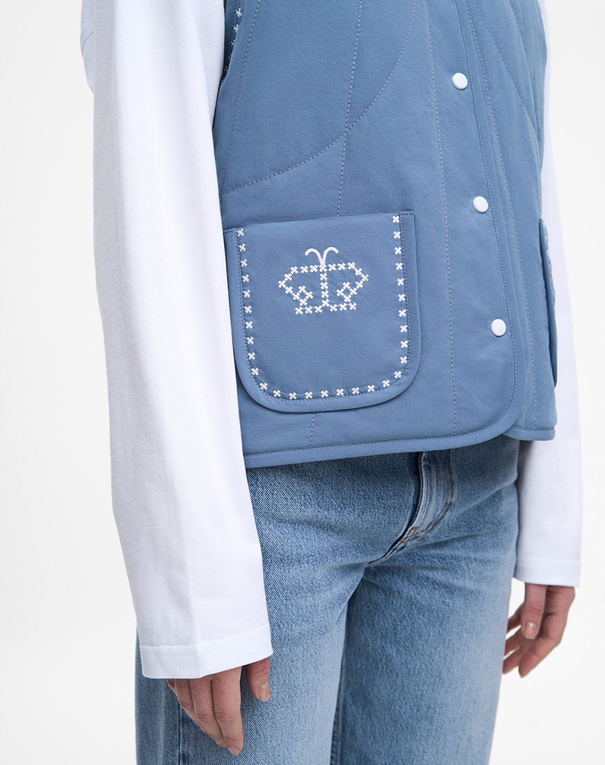 Функціональний крій жилета контрастує з наївним орнаментом, виконаним хрестиком. На таке оздоблення нас надихнули рушники минулого століття, розшиті метеликами. А стьобані лінії доповнюють дизайн виробу, нагадуючи тендітні крильця.