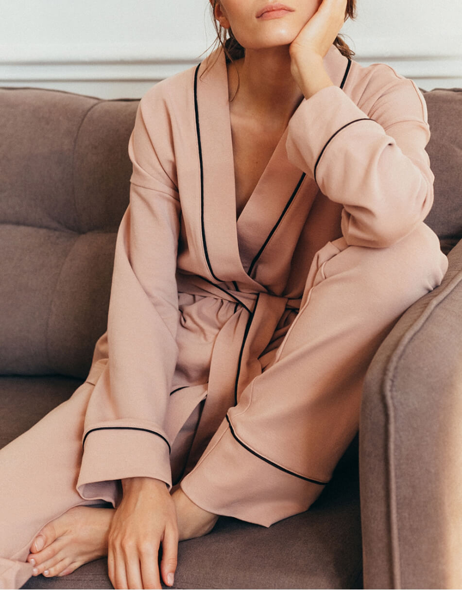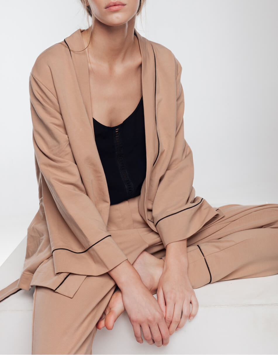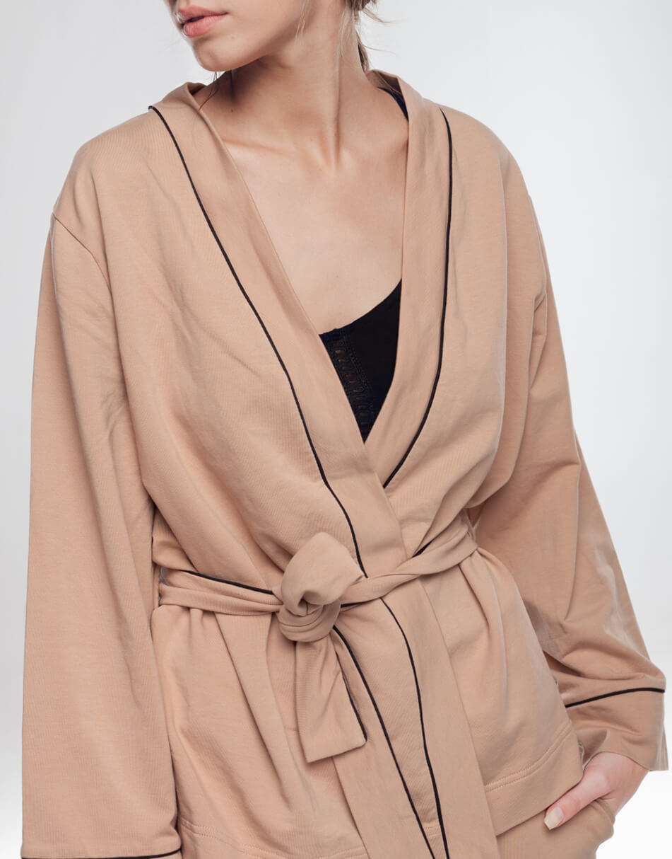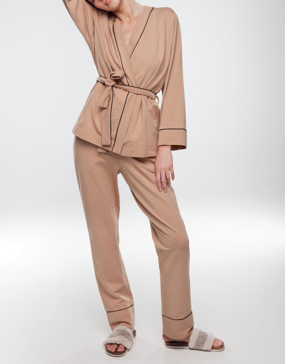 Комплект з накидки і штанів пудрового кольору з чорним кантом. Кардиган на запах, з поясом на талії. Штани стандартної довжини на гумці з бічними кишенями. Вільний крій. Костюм зручний і приємний до тіла.