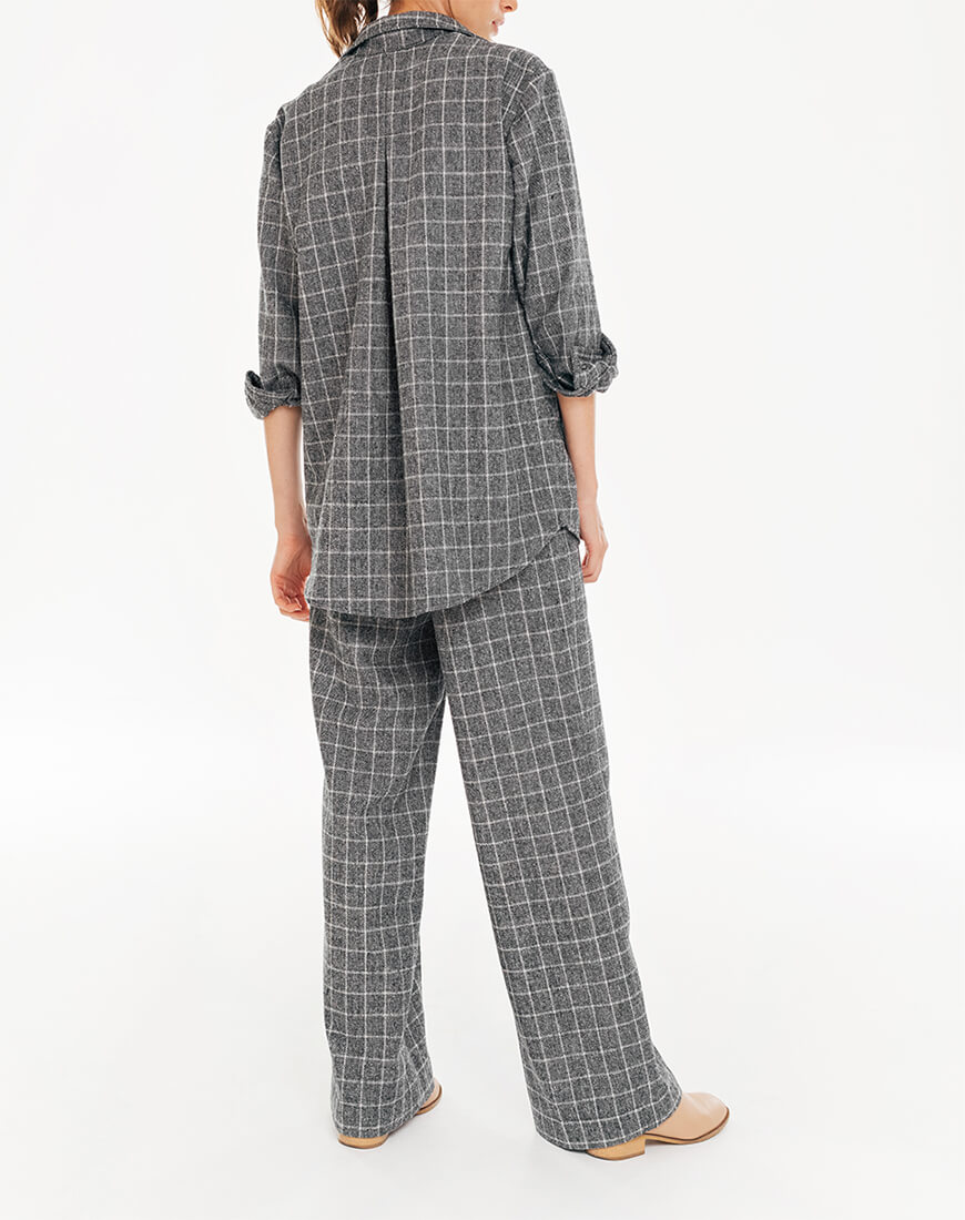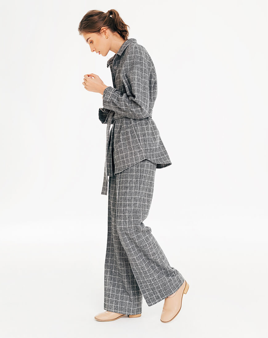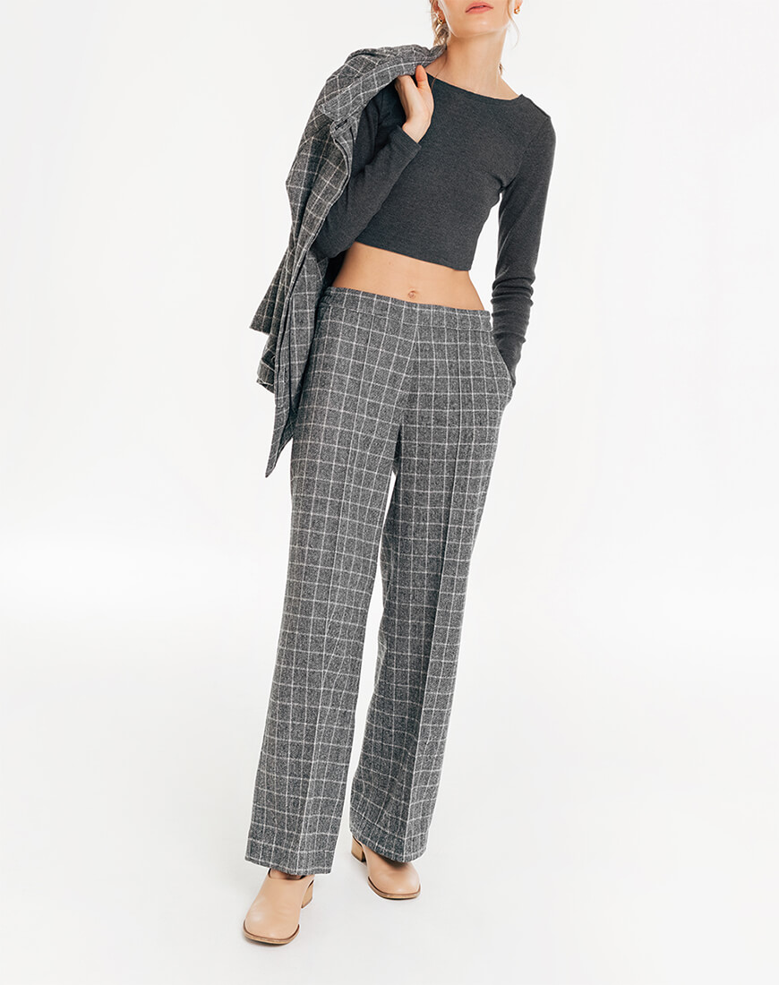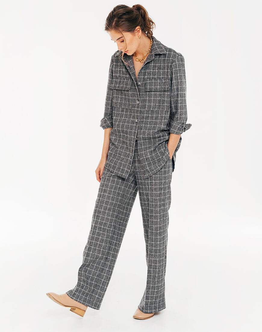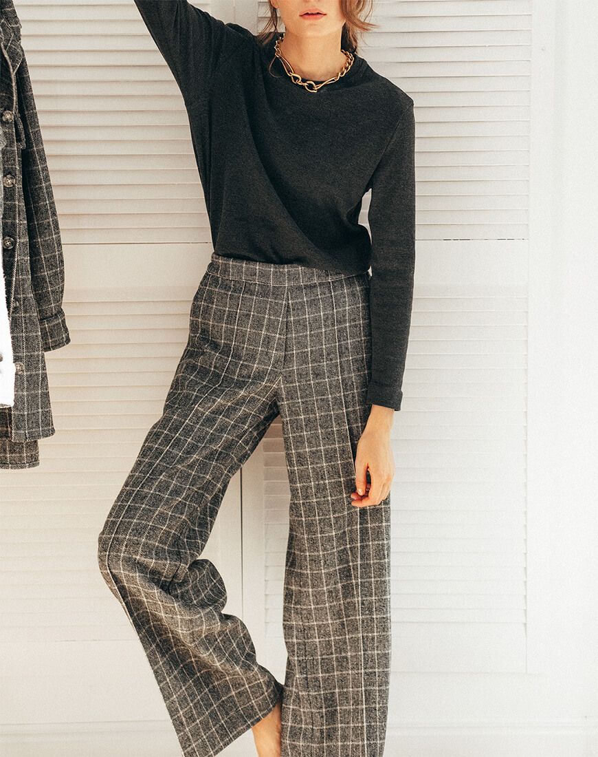 Штани в чорно-білу клітинку. Штани кльош. Тканина м’яка, невибаглива в догляді. Походження тканини: Іспанія, Валенсія. Спереду складка і загладжена стрілка. Посадка висока, з гульфиком на блискавці. З боків кишені.