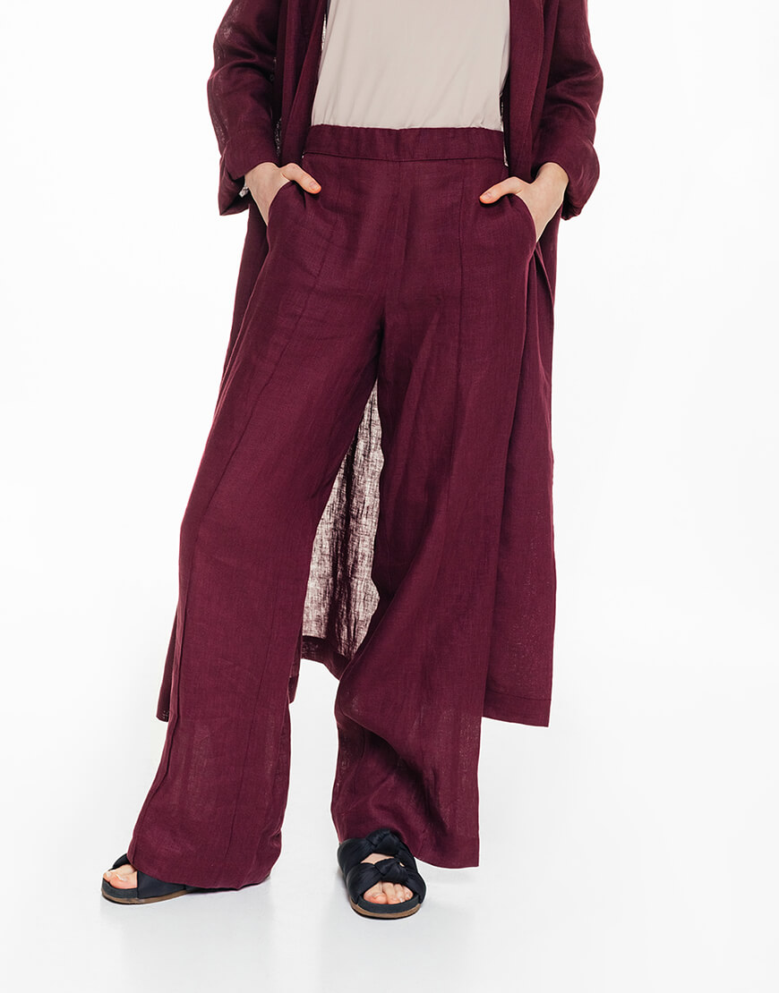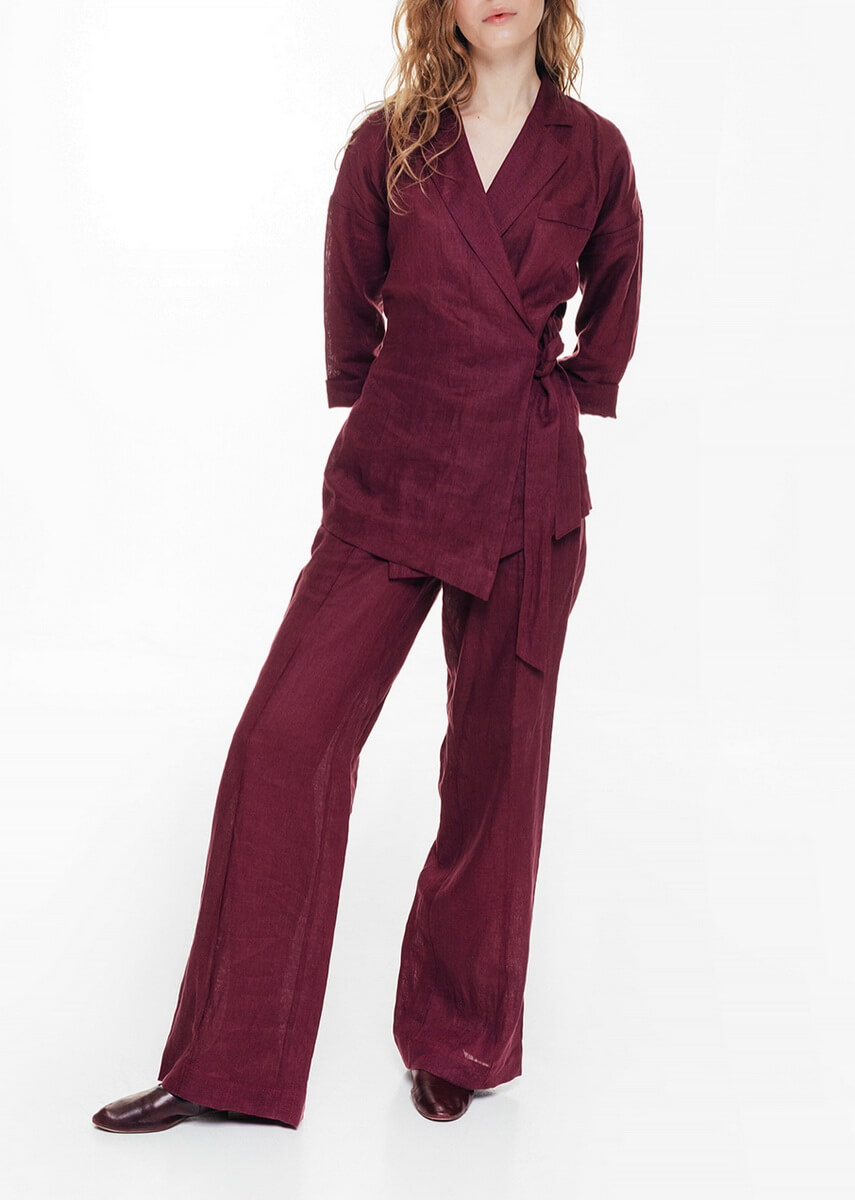 Жакет із льону кольору марсала із зав’язкою збоку на талії. Вільний крій, затягується поясом. Комір з лацканами, спереду імітація нагрудної кишені. Лляні штани кольору марсала, розширені до низу. Висока посадка, пояс ззаду на гумці. Спереду штанів декоративний рядок-стрілка. З боків зручні кишені.