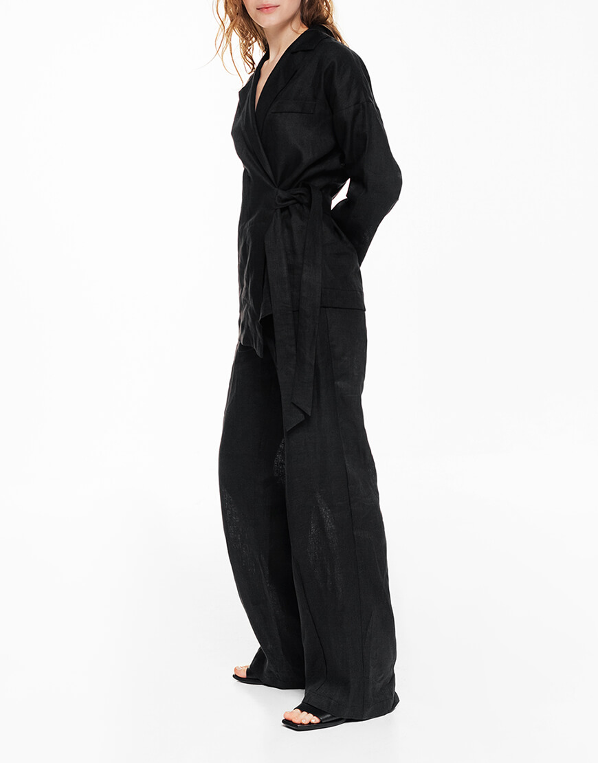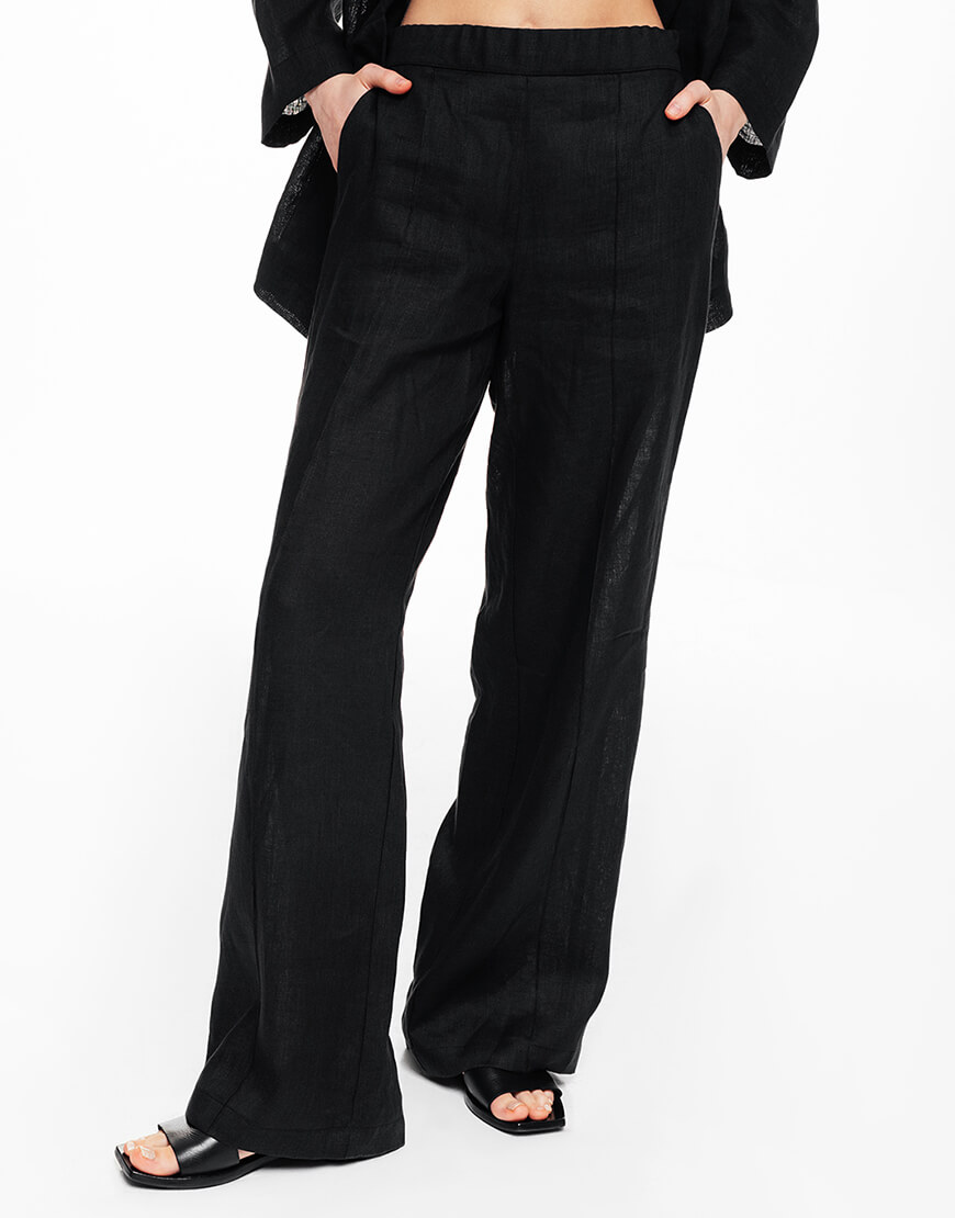Лляні штани кольору марсала, розширені до низу. Висока посадка, пояс ззаду на гумці. Спереду штанів декоративний рядок-стрілка. З боків зручні кишені.