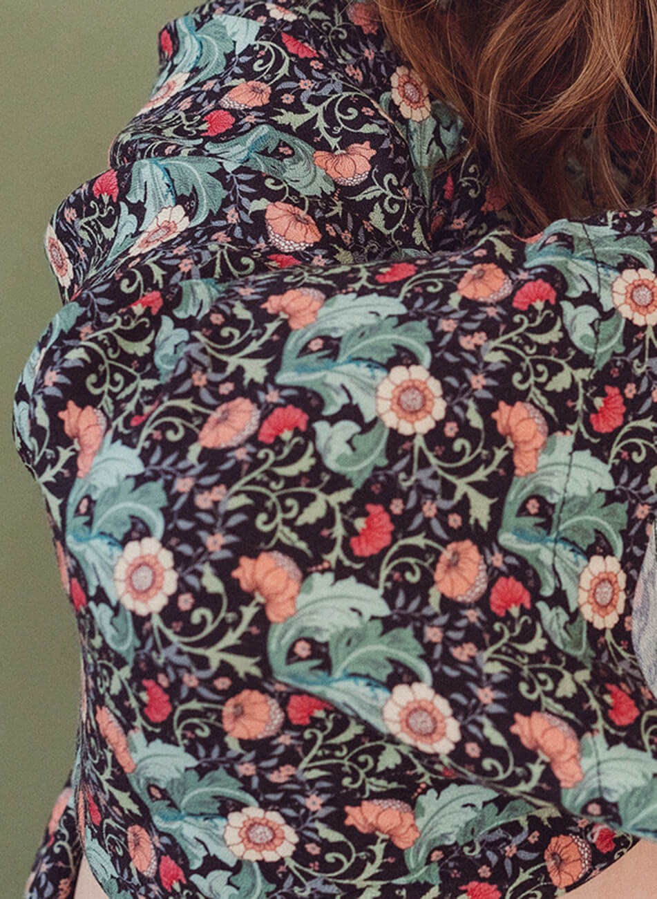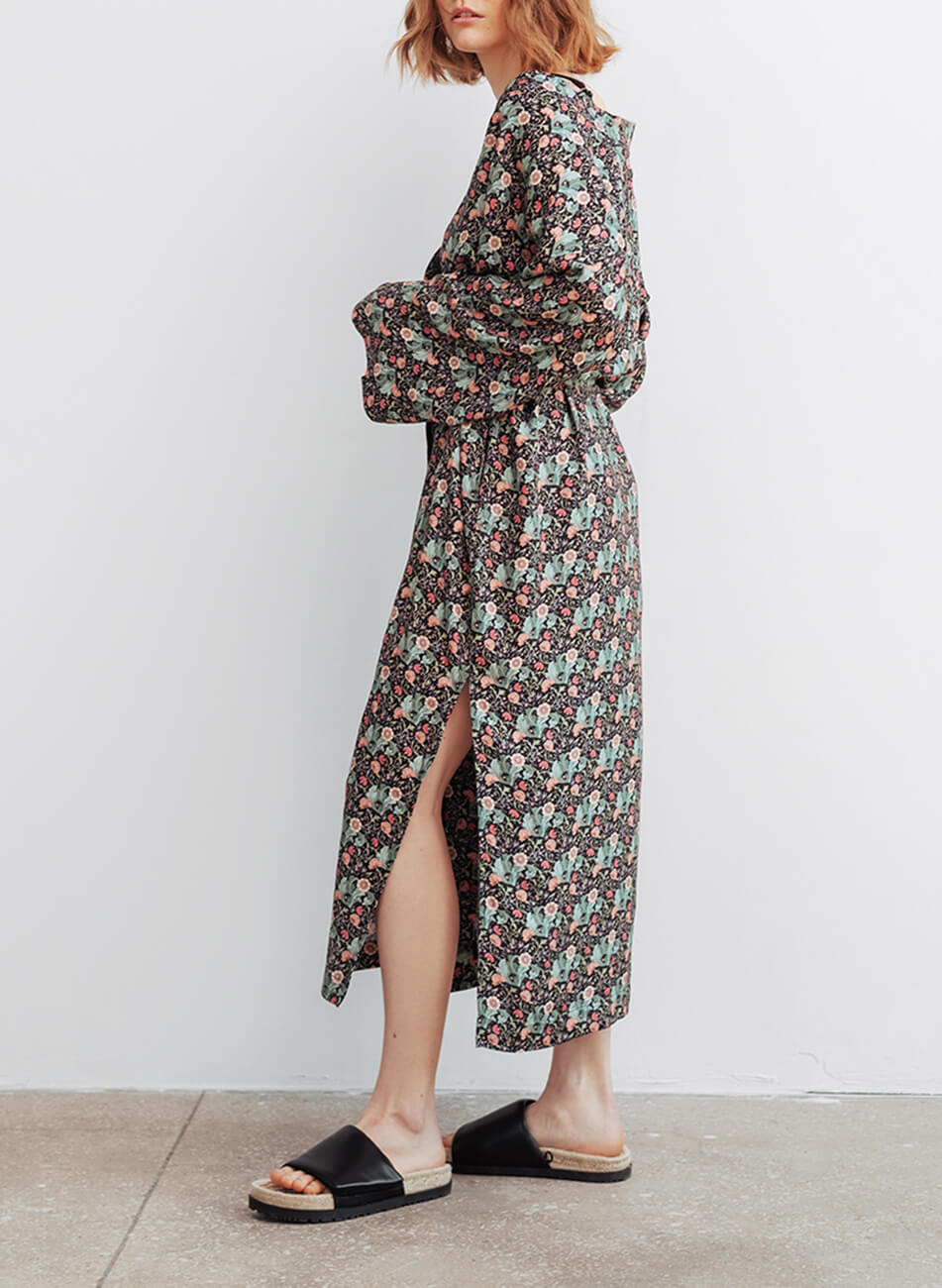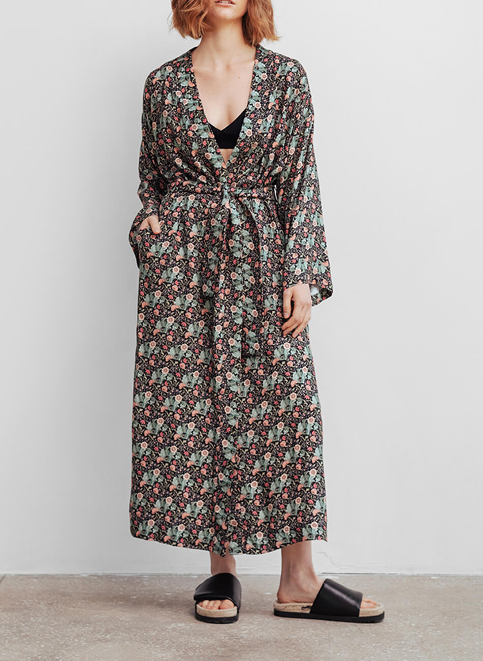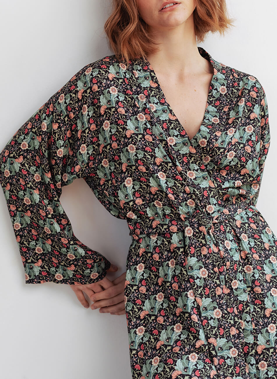 Тканина – віскоза, легка і приємна до тіла. Широкі рукави стандартної довжини. Халат на запах, з поясом на талії. Всередині є додаткова зав’язка на талії. З боків зручні кишені. Халат з розрізами вище коліна, Халат принтований у квіти на чорному тлі.