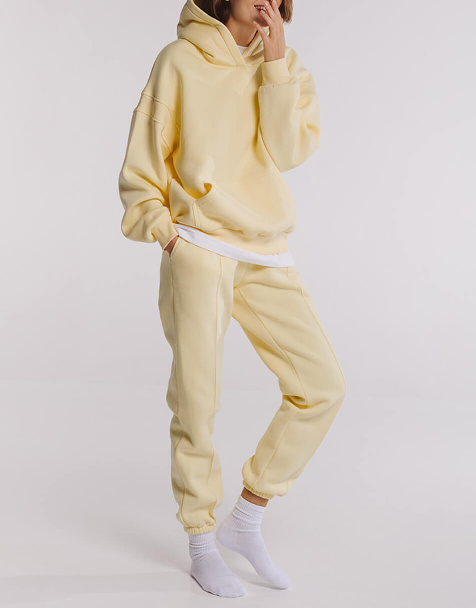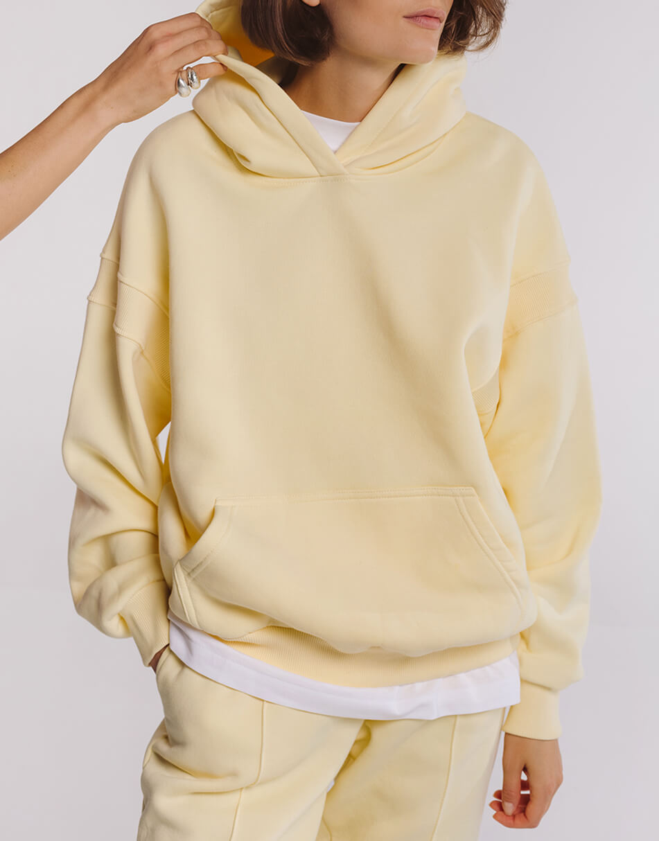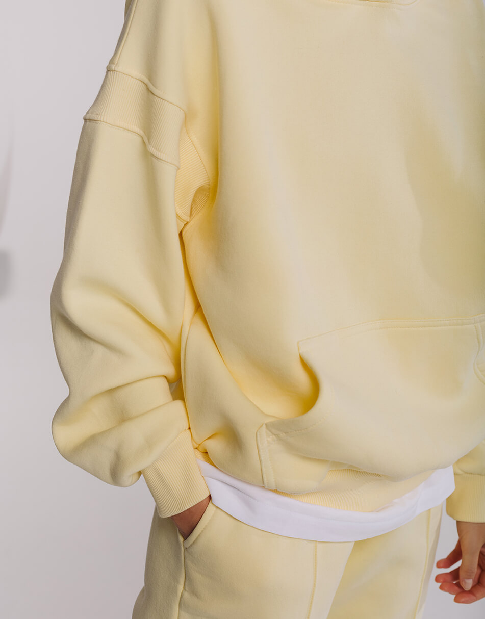 Набір жовтого кольору кофта і штани. Худі оверсайз зі вставками. Кофта з капюшоном, кишеня-кенгуру. З начосом. Штани на гумці з бічними кишенями. Спереду штанів декоративний рядок-стрілка. Внизу штанів гумка.