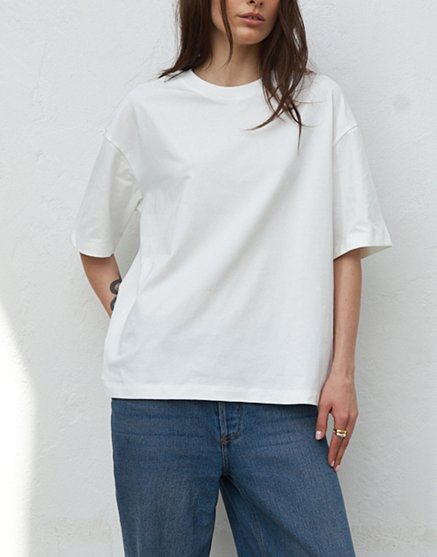 Доставка впродовж 2-5 робочих днівБіла футболка теплого відтінку, оверсайз. Виконана із цупкого натурального котону, що добре тримає форму та не просвічує. Трикотаж найвищої якості, довговічний та невибагливий у догляді.
