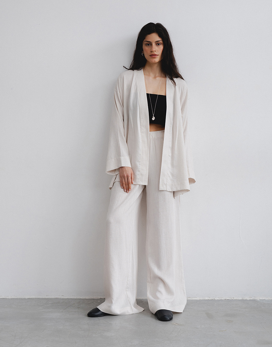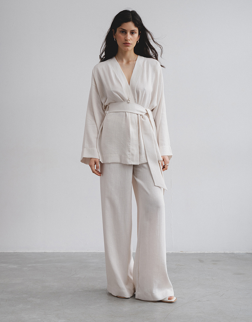 Доставка впродовж 2-5 робочих днівНабір кімоно та штани-палаццо з віскози преміум якості. Світло-бежевий відтінок, з вираженою фактурою. Можливе машинне прання, практично не потребує прасування. Не просвічується. Кімоно one size, штани по розмірах.