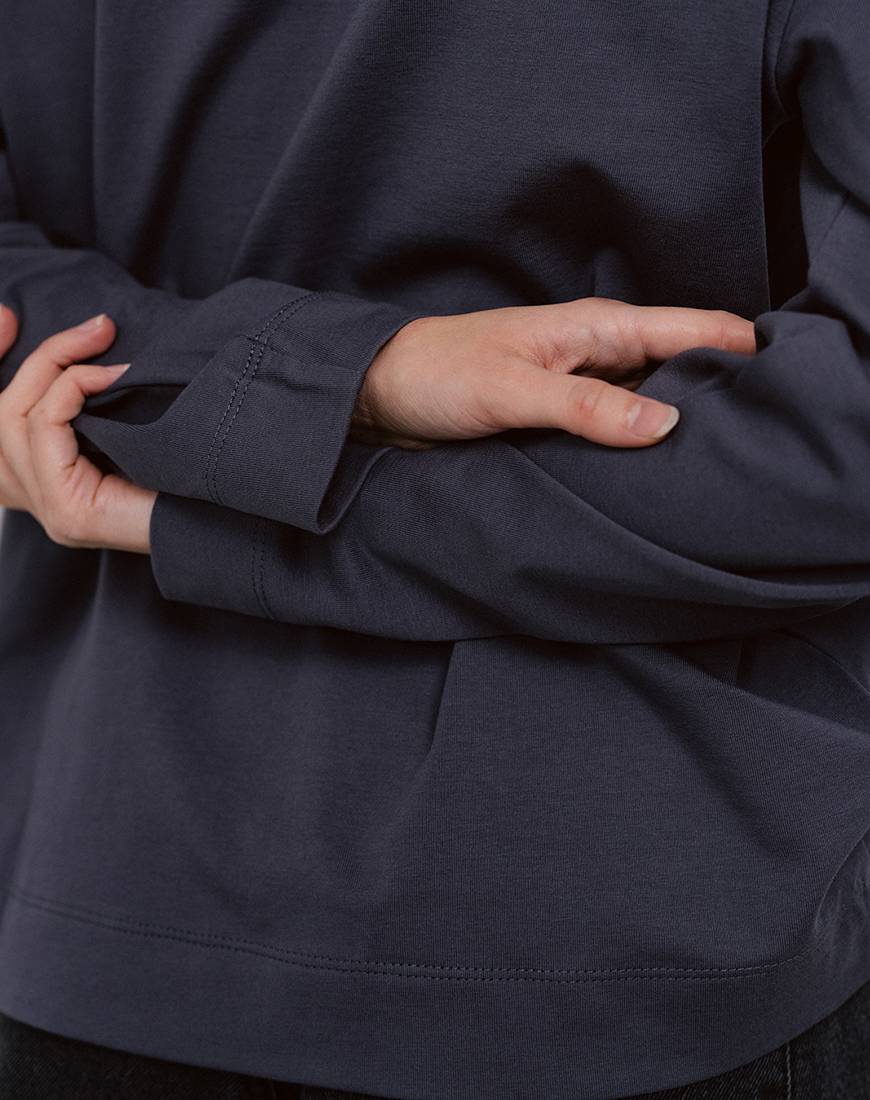 Доставка впродовж 2-5 робочих днівЛонгслів зі щільного трикотажу (230-240 г/м2) темно-сірого кольору. М’який на дотик, злегка тягнеться. Трикотаж найвищої якості, довговічний та невибагливий у догляді. Силует — оверсайз, можна обирати на розмір менше.