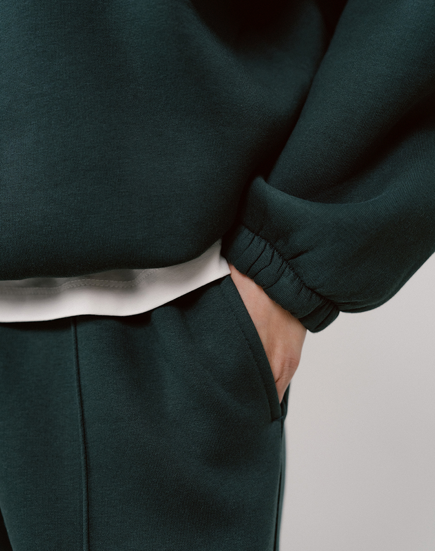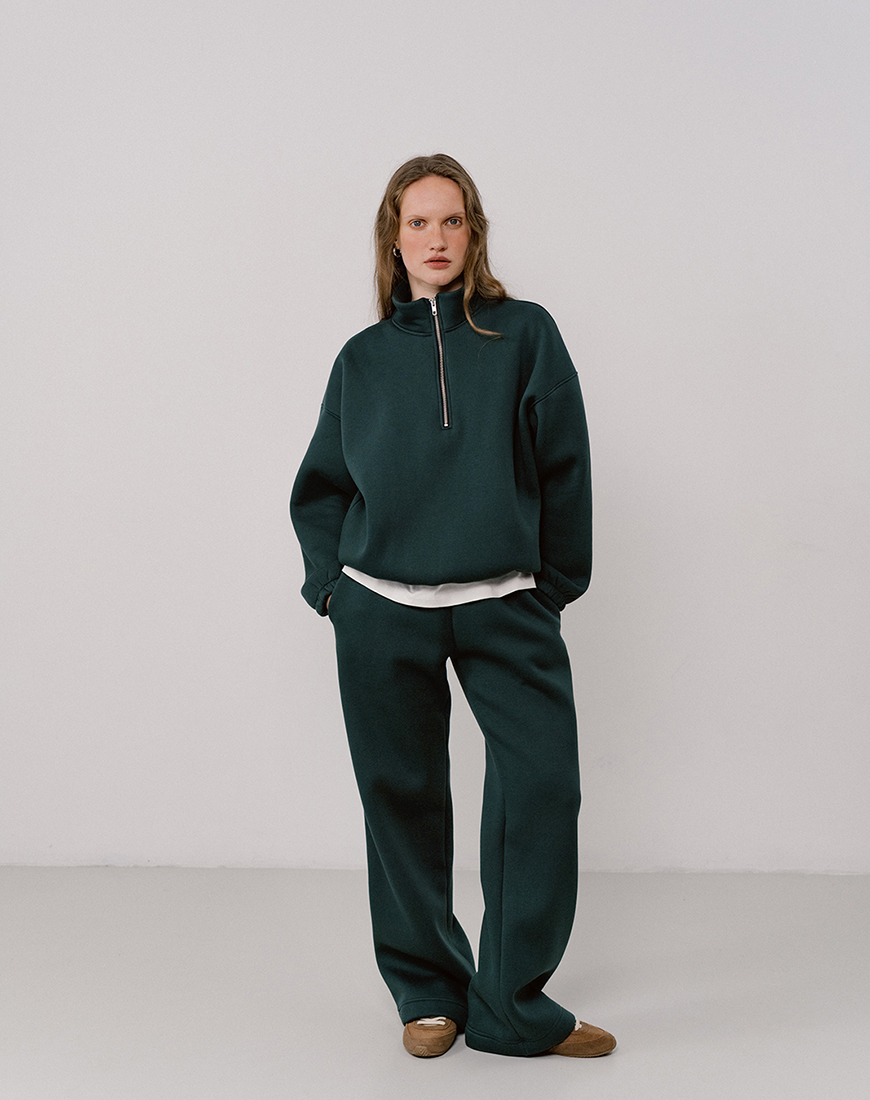 Доставка впродовж 2-5 робочих днівСвітшот з коротким замком з утепленого трикотажу темно-зеленого кольору. Низ виробу та рукави на резинках. Оверсайз крій, широкий рукав. Розмір XS розрахований на зріст до 162 см.
