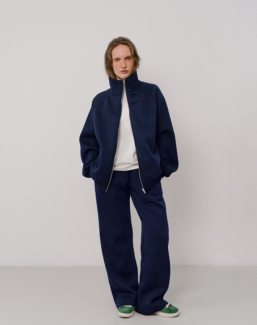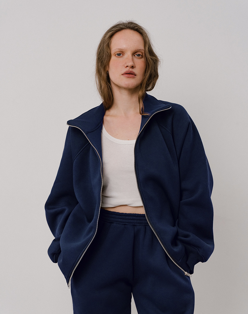 Світшот на замку темно-синього кольору. Утеплений трикотаж з начосом, добре тримає форму та неймовірно теплий. Крій оверсайз, рукав реглан. По боках кишені.