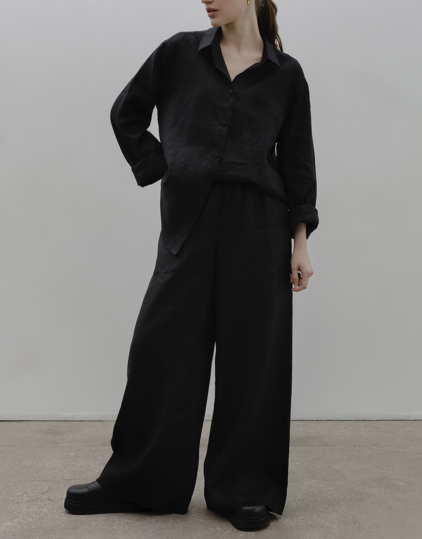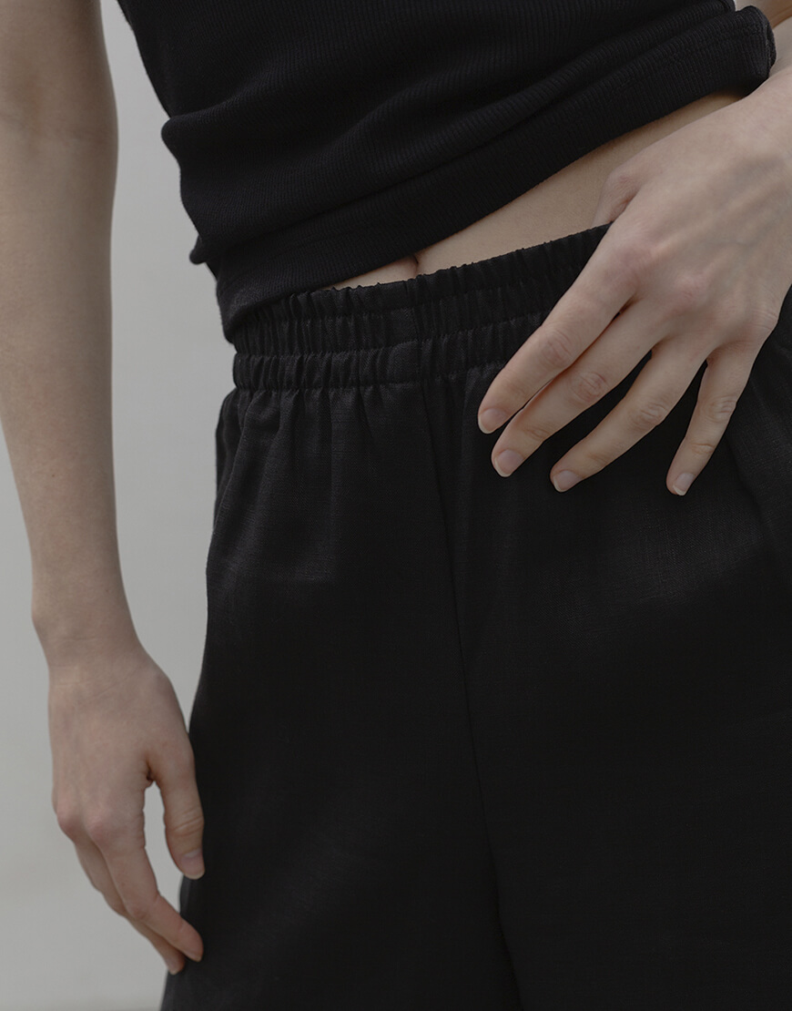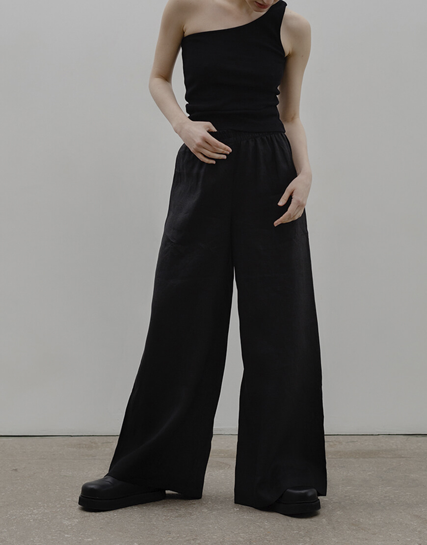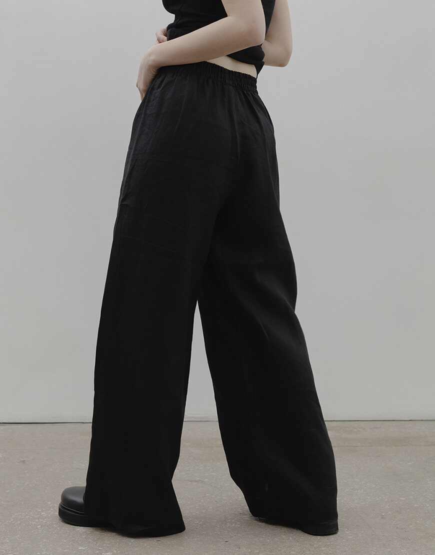 Штани з натурального льону, широкі від стегна. Висока комфортна посадка, пояс на резинці