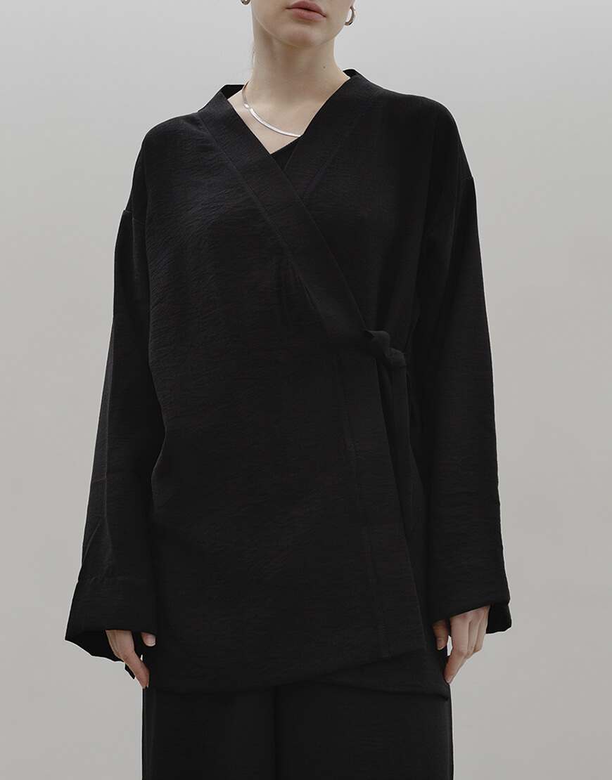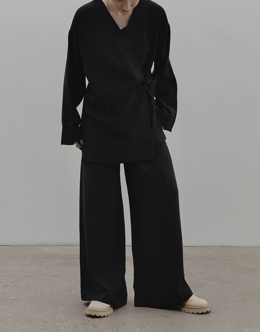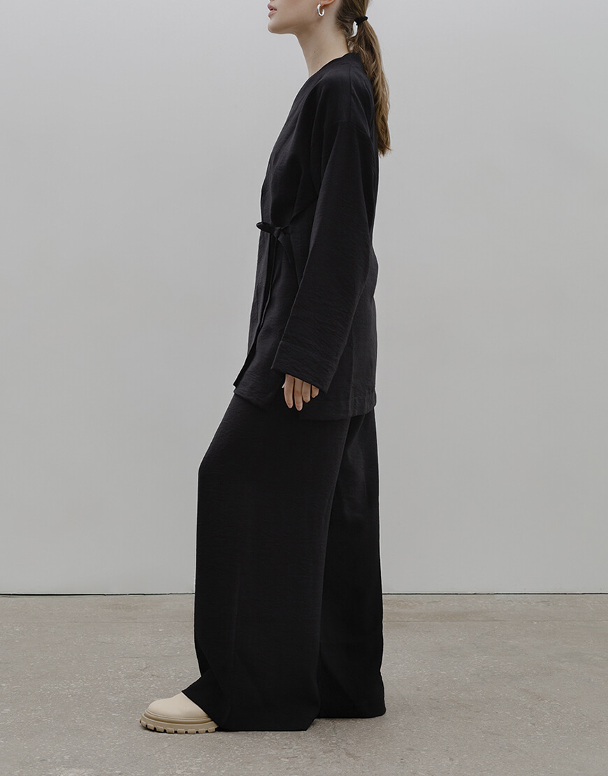 Набір чорного кольору з тканини з ефектом жатка. Тканина м’яка та легка, що не потребує прасування. Не просвічується. Кімоно спереду на зав’язці. Штани широкі, висока посадка. При машинному пранні виріб може дати усадку на 1-2 см по довжині